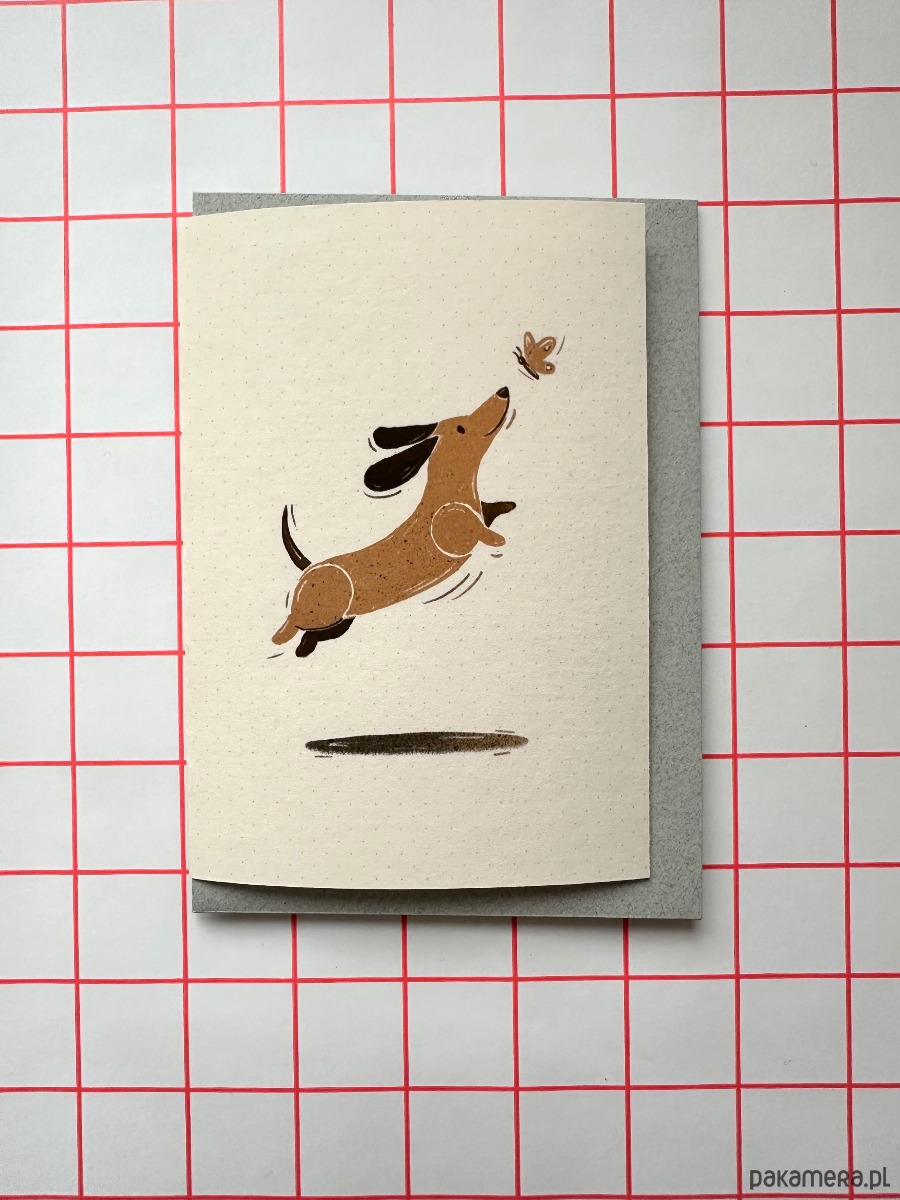 Autorska ilustracja przedstawiająca uroczego Jamniczka. Subtelne detale i ciepłe barwy nadają jej ponadczasowego uroku.