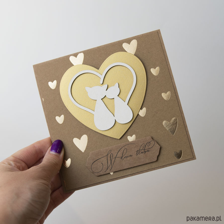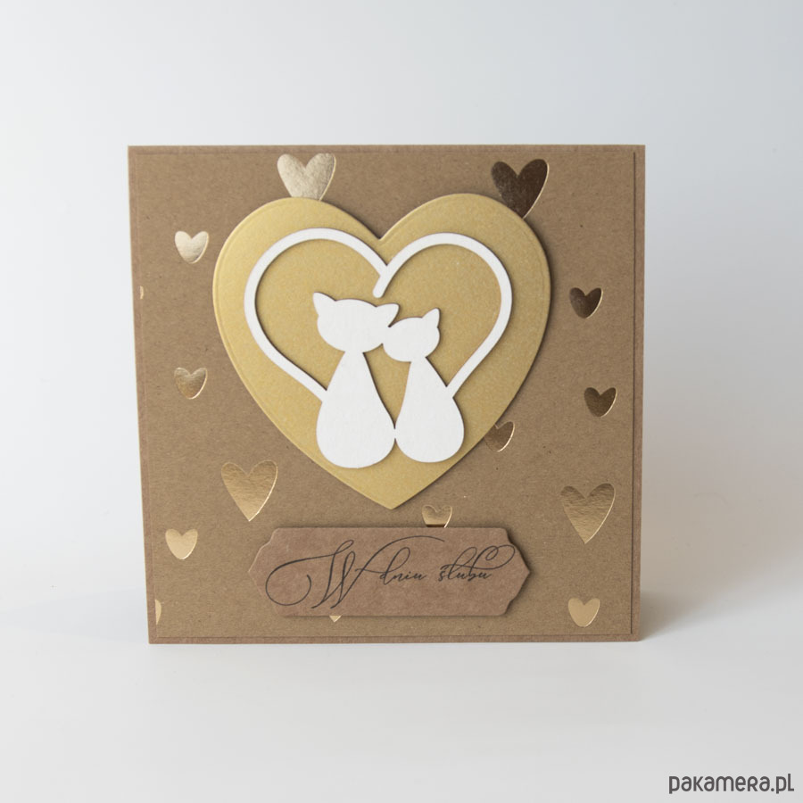 Ręcznie robiona kartka ślubna z motywem zakochanych kotów.