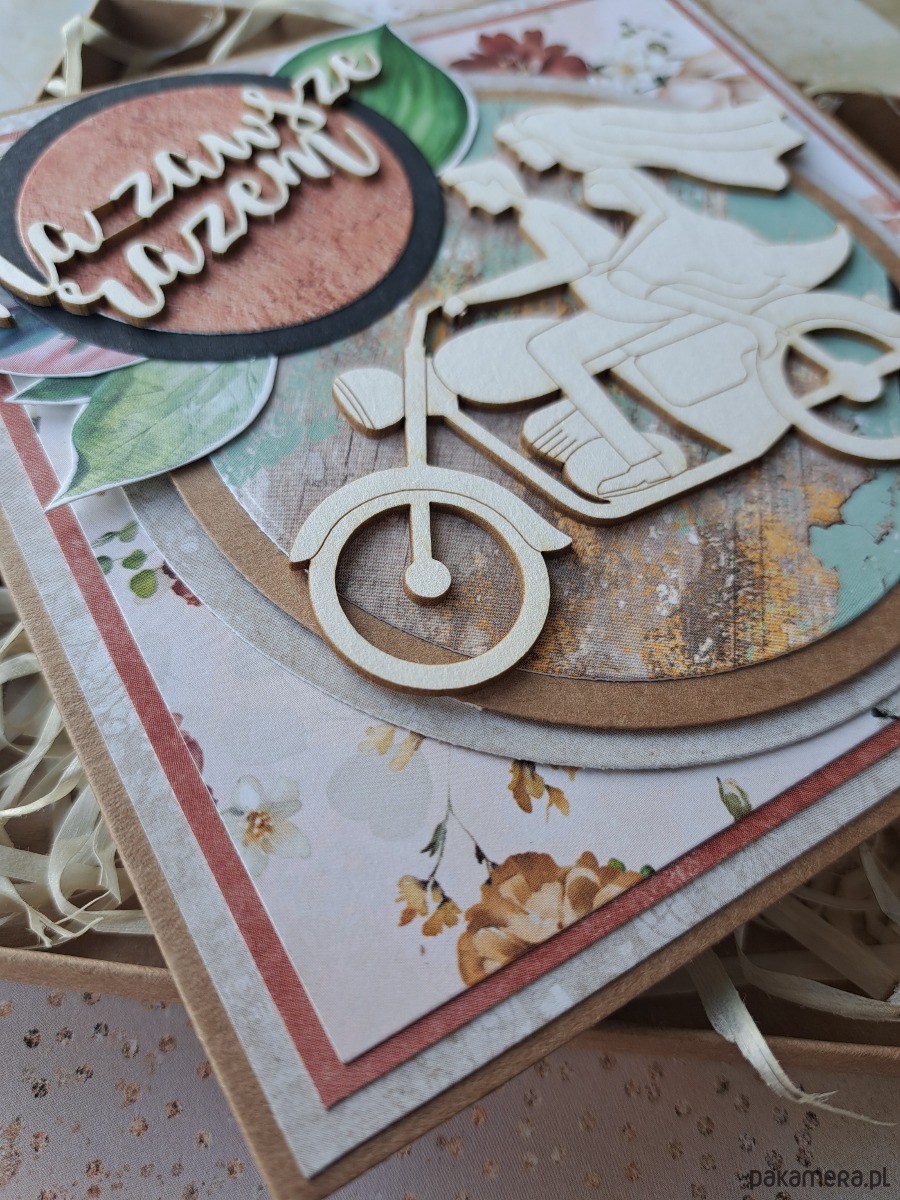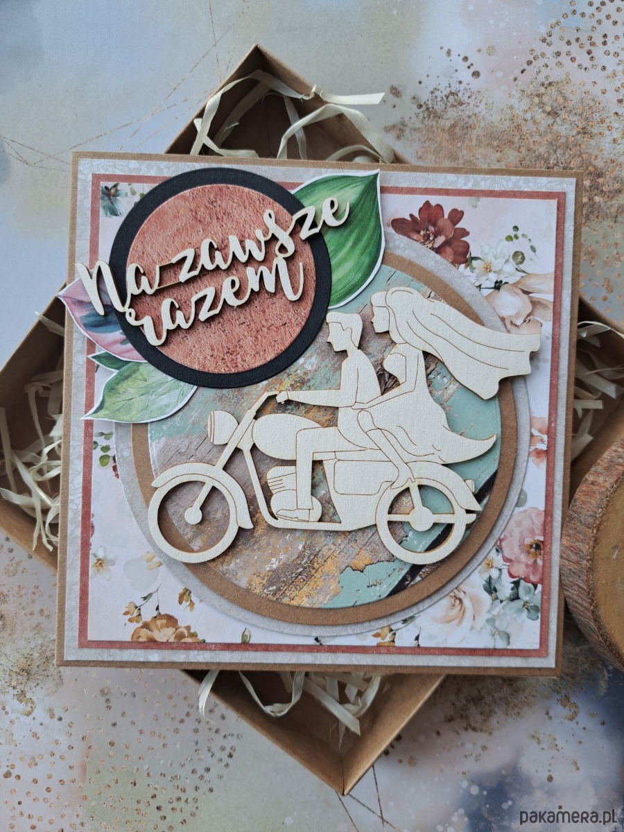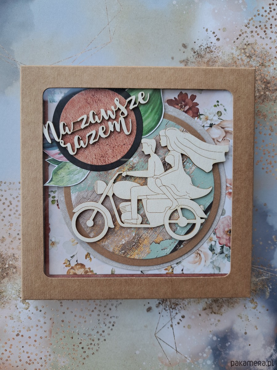 Kolorowa, warstwowa kartka na ślub z parą młodą na motocyklu.