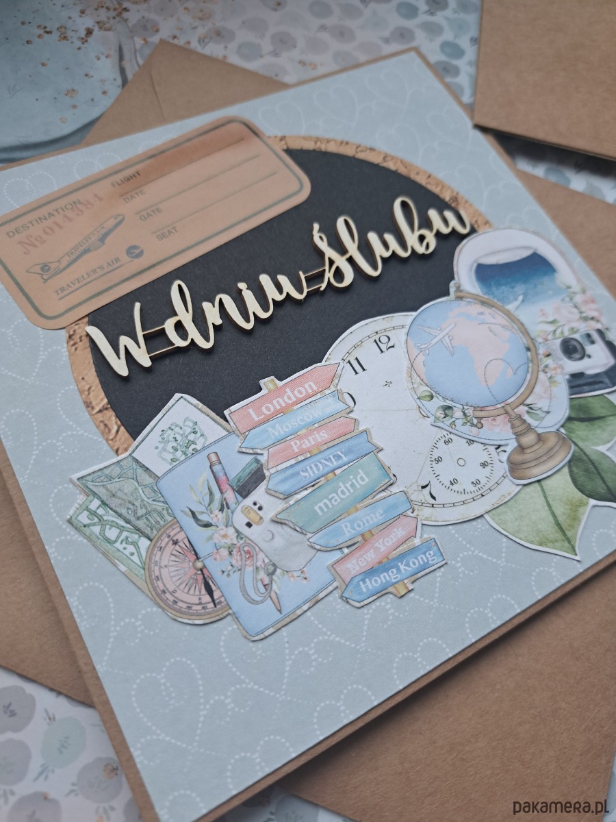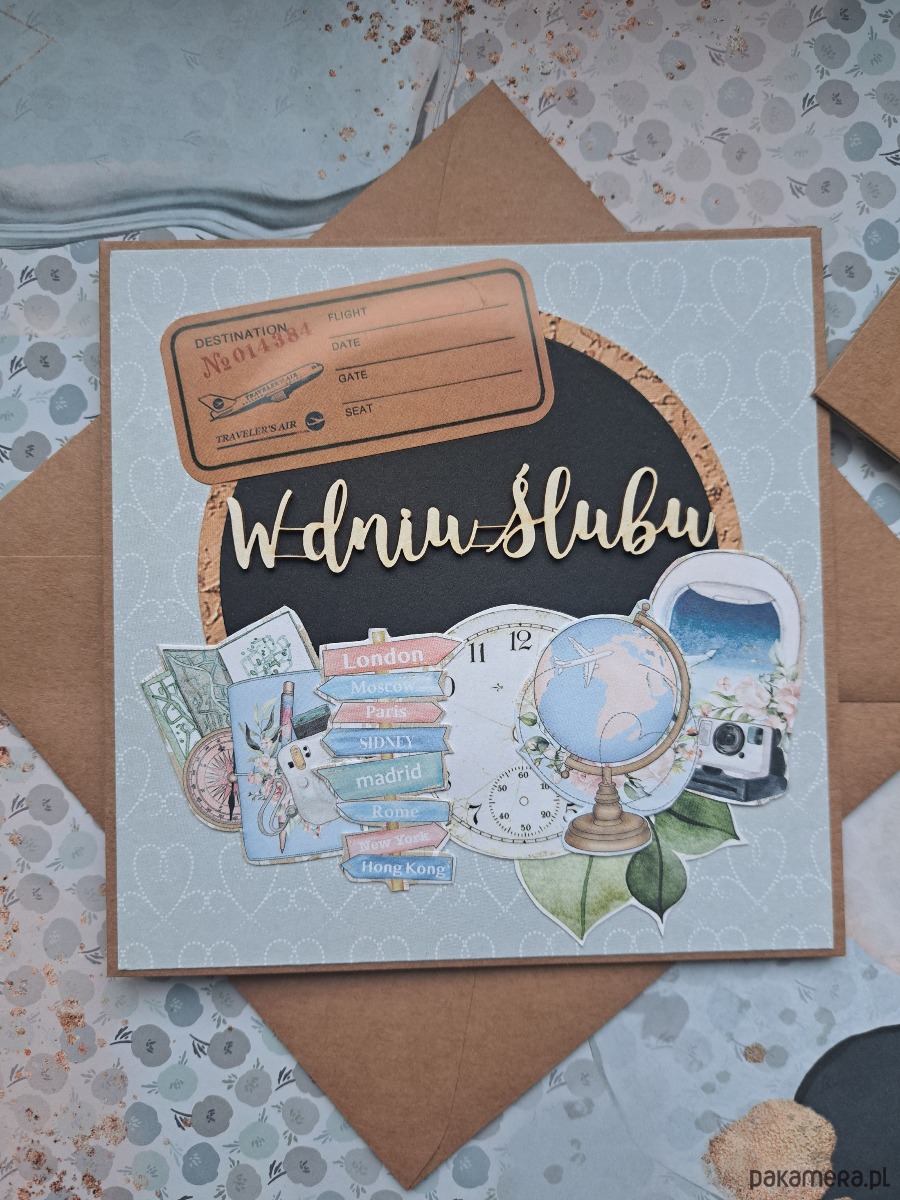 Ręcznie robiona kartka z okazji ślubu z motywem podróżniczym.