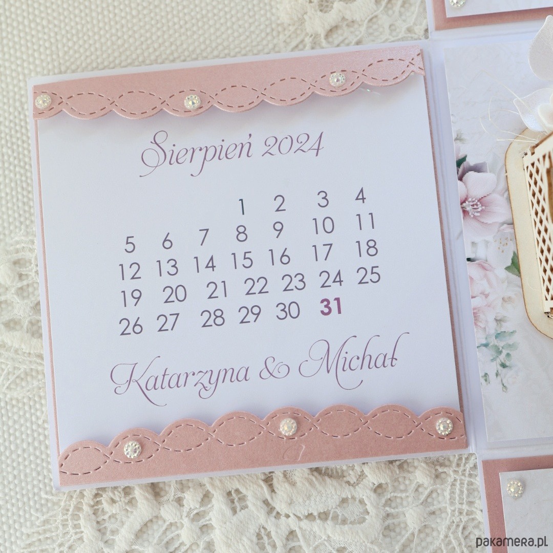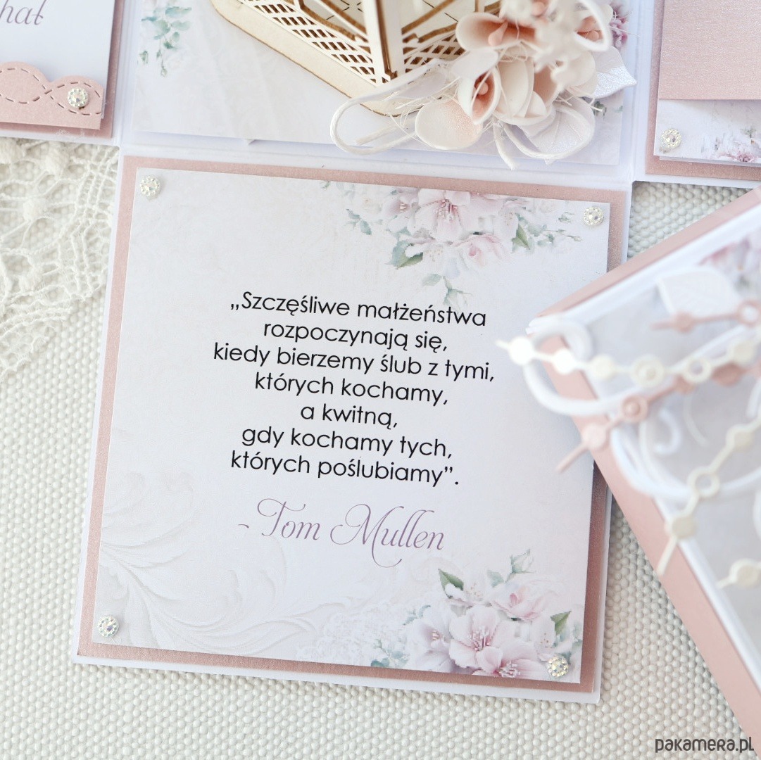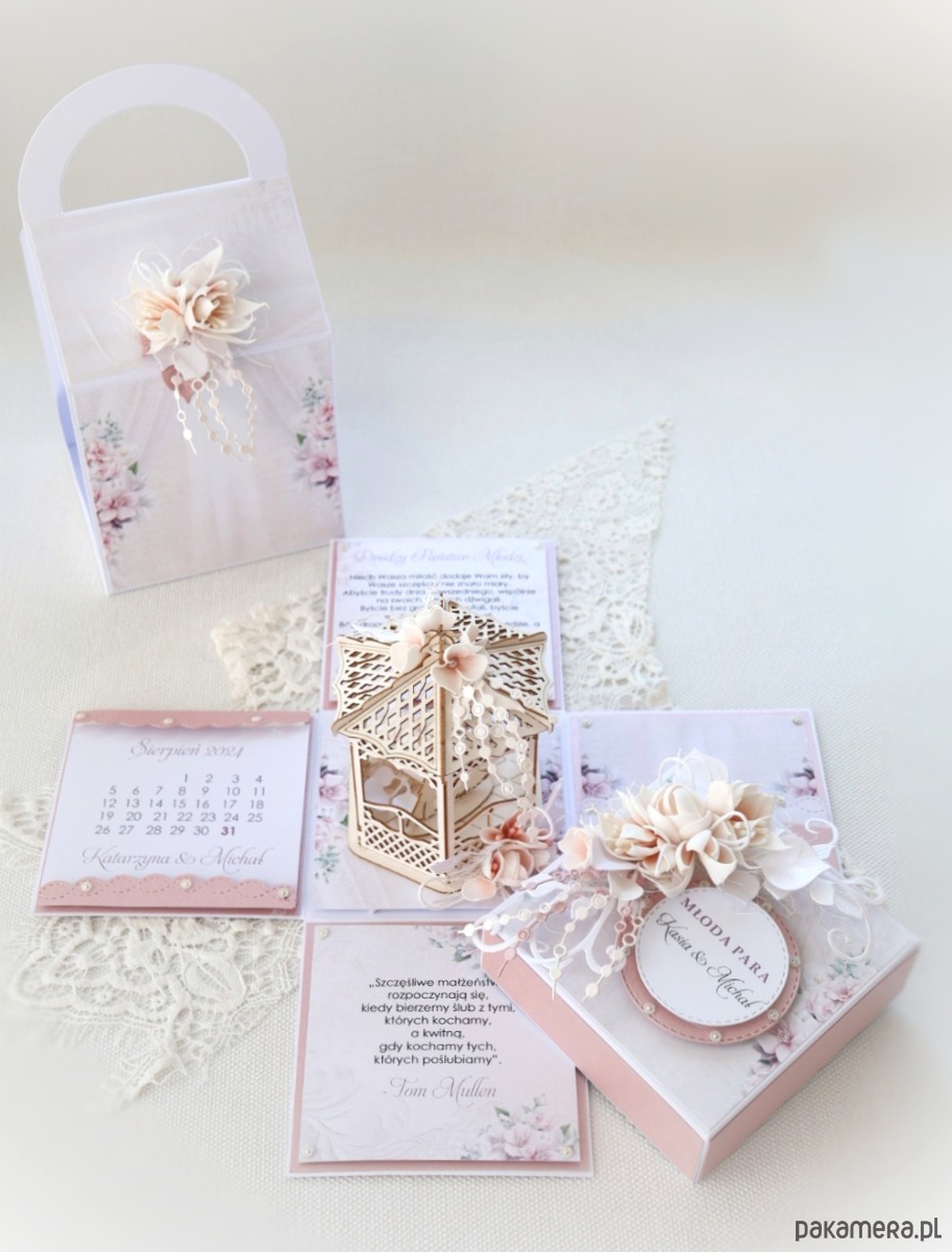 Na ściankach znajdują się życzenia, kartka z kalendarza, kieszonka na pieniądze, cytat.