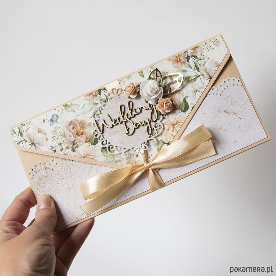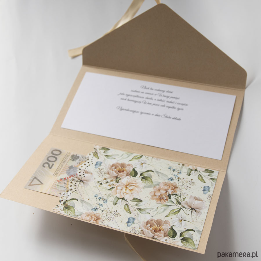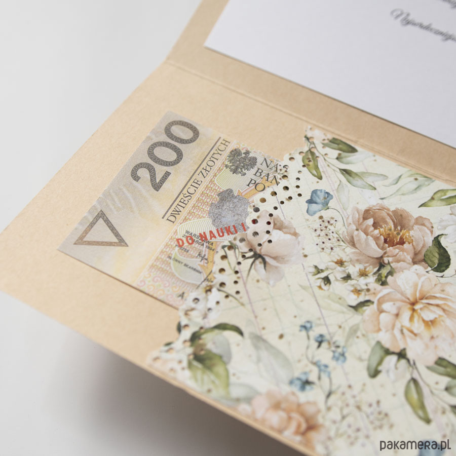 Kartka ma formę rozkładanego folderu, w środku znajduje się miejsce na życzenia oraz miejsce na pieniądze (kieszonka z wzorzystego papieru).