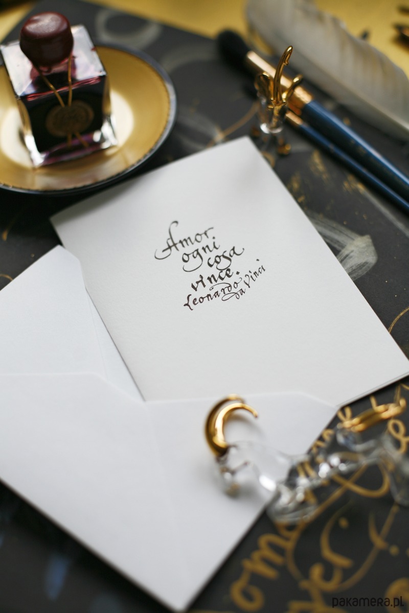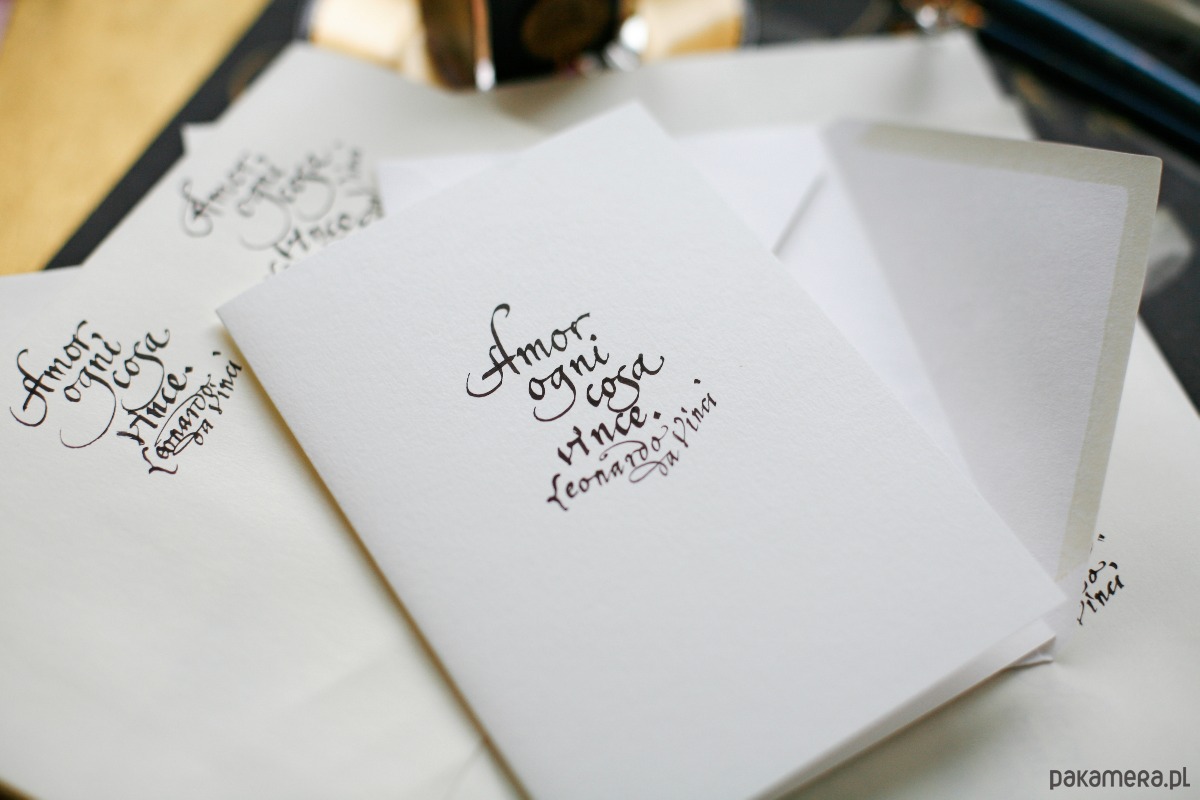 Kartka ślubna kaligrafowana atramentem Amor ogni cosa vince Leonardo da Vinci