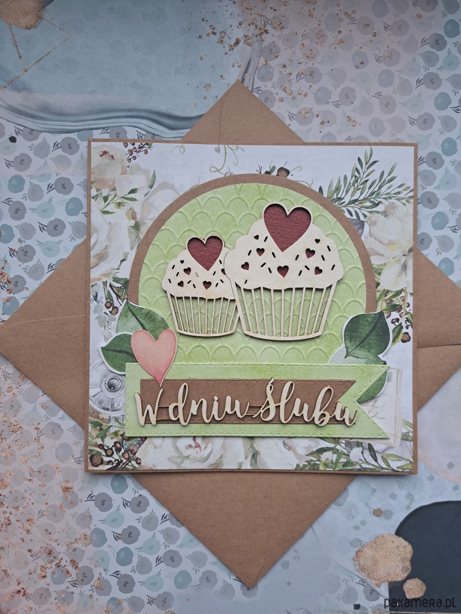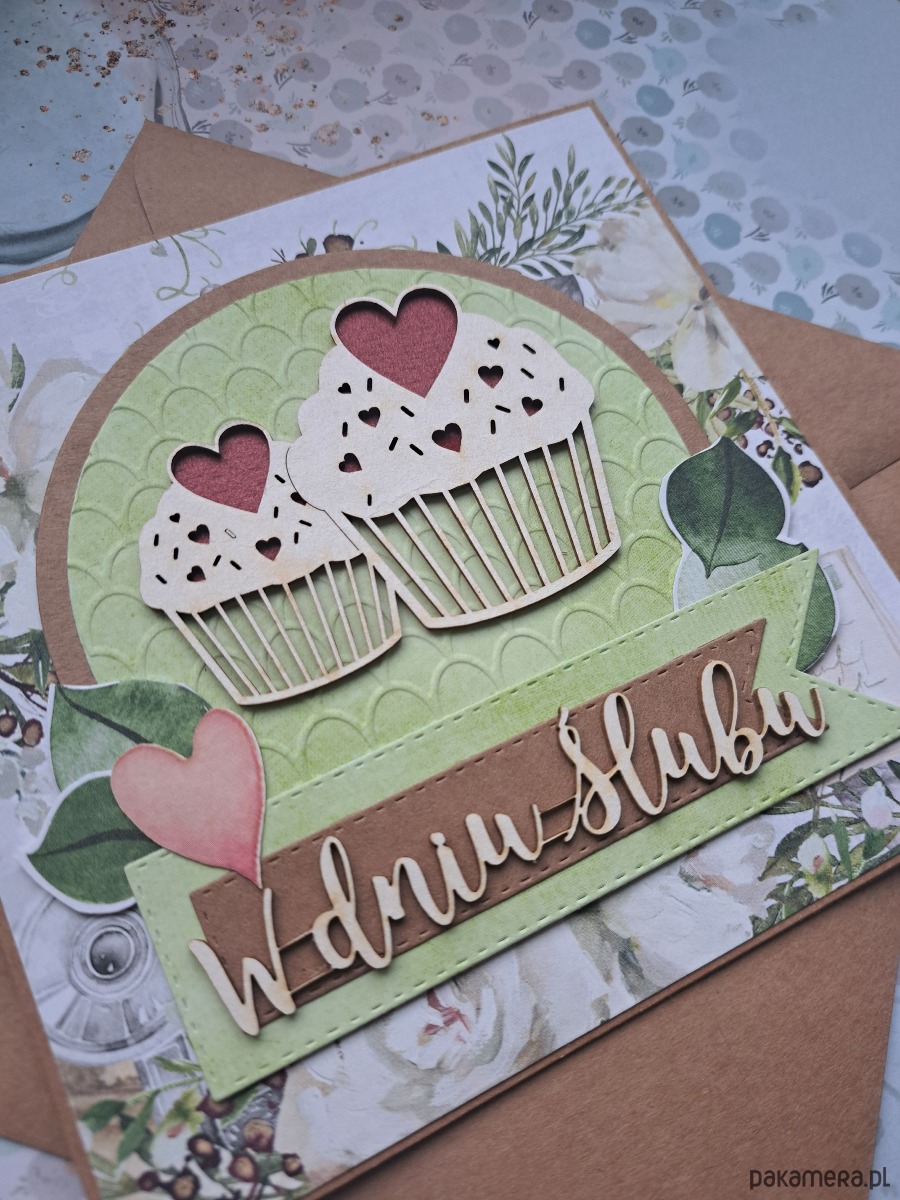 Kartka na ślub z zakochanymi muffinkami i napisem "W dniu ślubu"