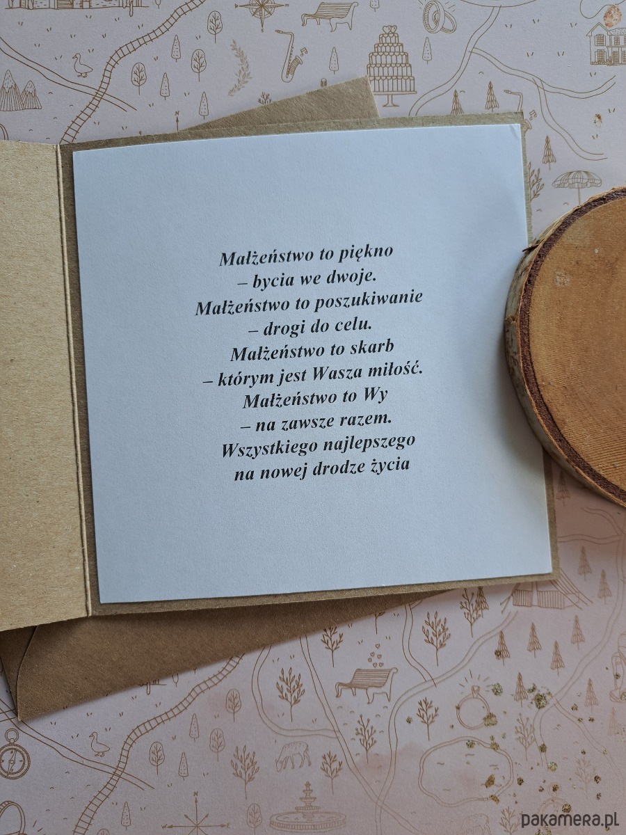 - w środku wklejona kartka z gotowymi życzeniami