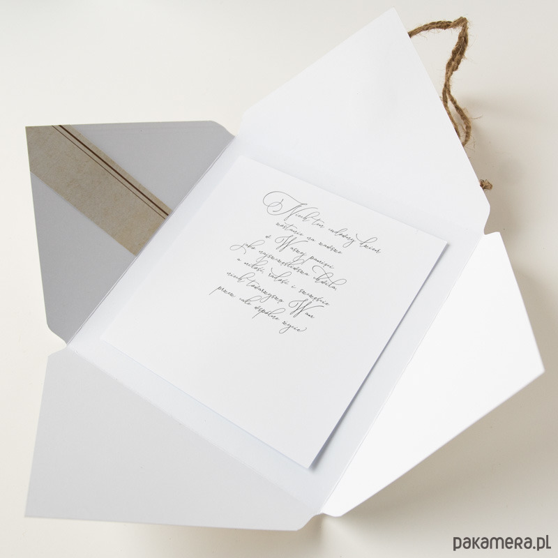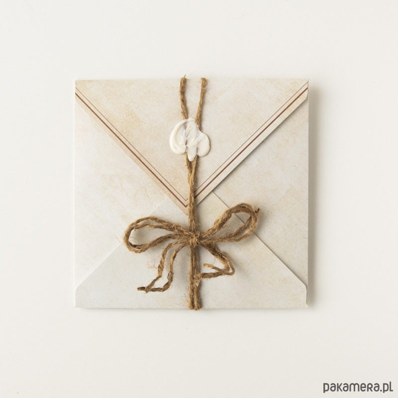 Ręcznie robiona koperta, przewiązana naturalnym sznureczkiem, po rozwiązaniu otwiera się tworząc dużą kartę z miejscem na pieniądze (kieszonka na lewym skrzydełku kartki pozwala na wsunięcie poskładanych banknotów).