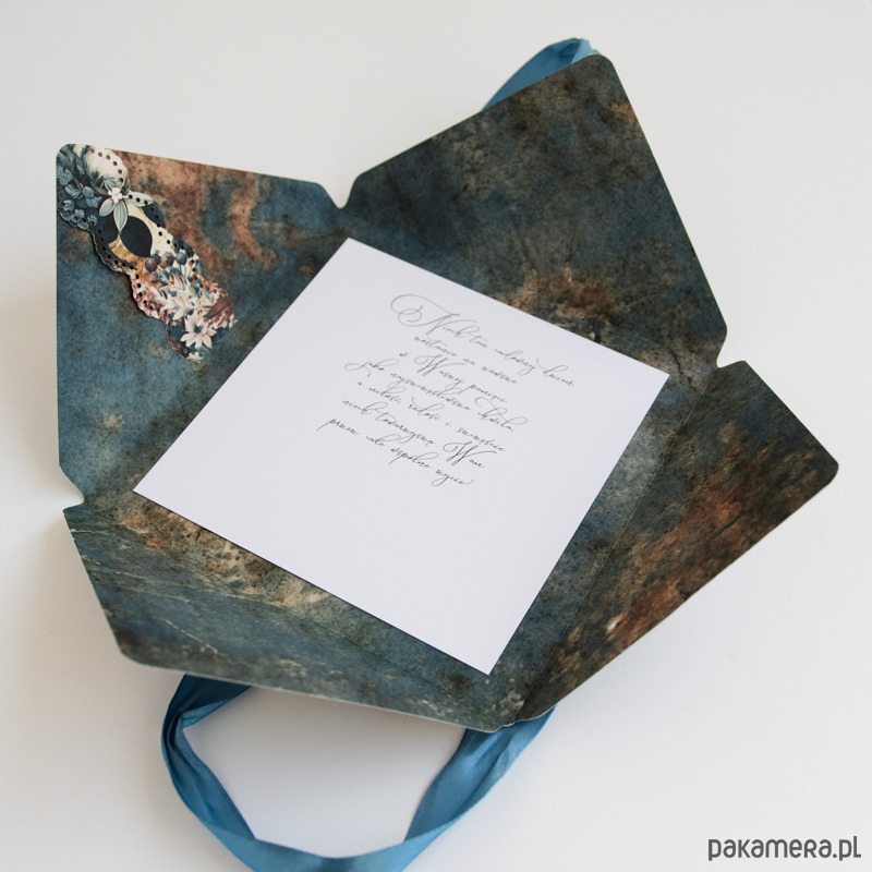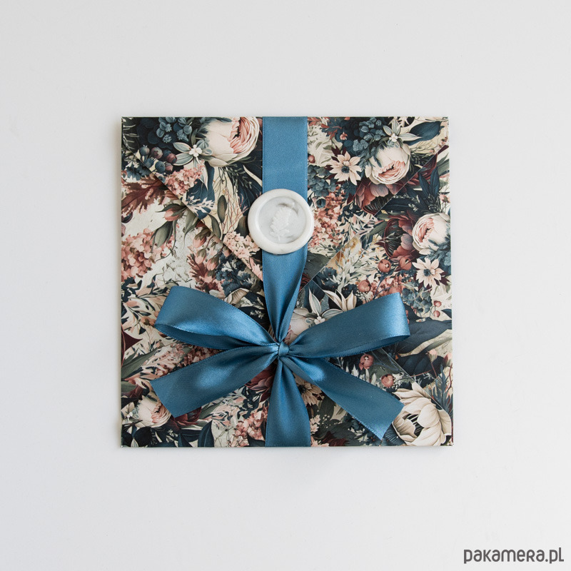 Ręcznie robiona koperta, przewiązana tasiemką, po rozwiązaniu kokardy otwiera się tworząc dużą kartę z miejscem na pieniądze (ozdobna kieszonka na lewym skrzydełku kartki pozwala na wsunięcie poskładanych banknotów).