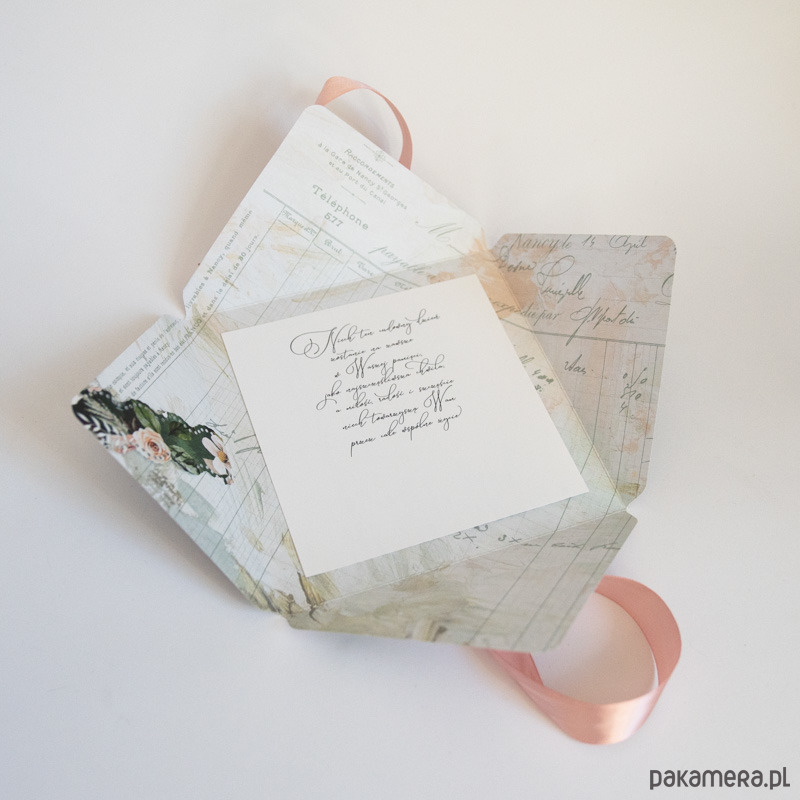 Ręcznie robiona koperta, przewiązana tasiemką, po rozwiązaniu kokardy otwiera się tworząc dużą kartę z miejscem na pieniądze (ozdobna kieszonka na lewym skrzydełku kartki pozwala na wsunięcie poskładanych banknotów).