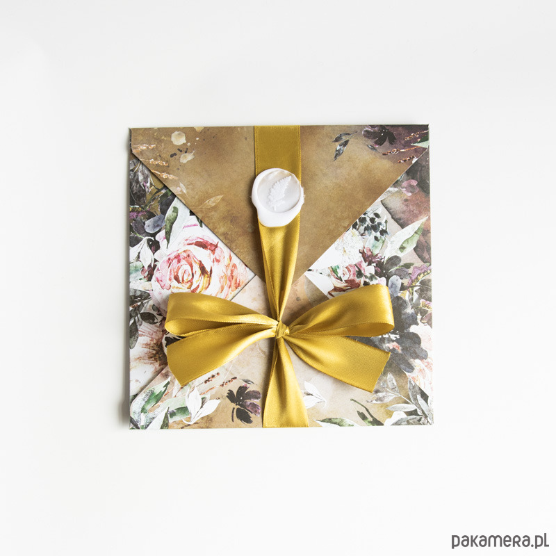 Ręcznie robiona koperta, przewiązana tasiemką, po rozwiązaniu kokardy otwiera się tworząc dużą kartę z miejscem na pieniądze (ozdobna kieszonka na lewym skrzydełku kartki pozwala na wsunięcie poskładanych banknotów).