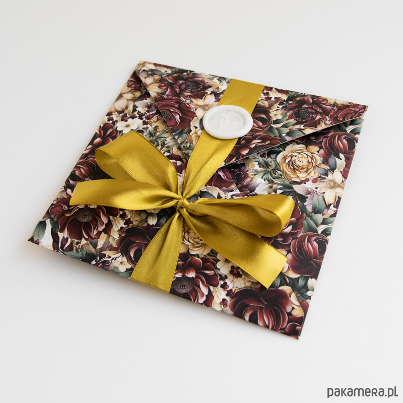 Ręcznie robiona koperta, przewiązana tasiemką, po rozwiązaniu kokardy otwiera się tworząc dużą kartę z miejscem na pieniądze (ozdobna kieszonka na lewym skrzydełku kartki pozwala na wsunięcie poskładanych banknotów).