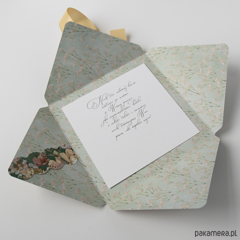 Ręcznie robiona koperta, przewiązana tasiemką, po rozwiązaniu kokardy otwiera się tworząc dużą kartę z miejscem na pieniądze (ozdobna kieszonka na lewym skrzydełku kartki pozwala na wsunięcie poskładanych banknotów).