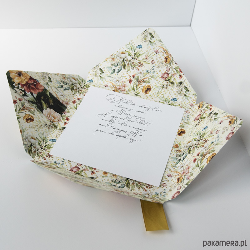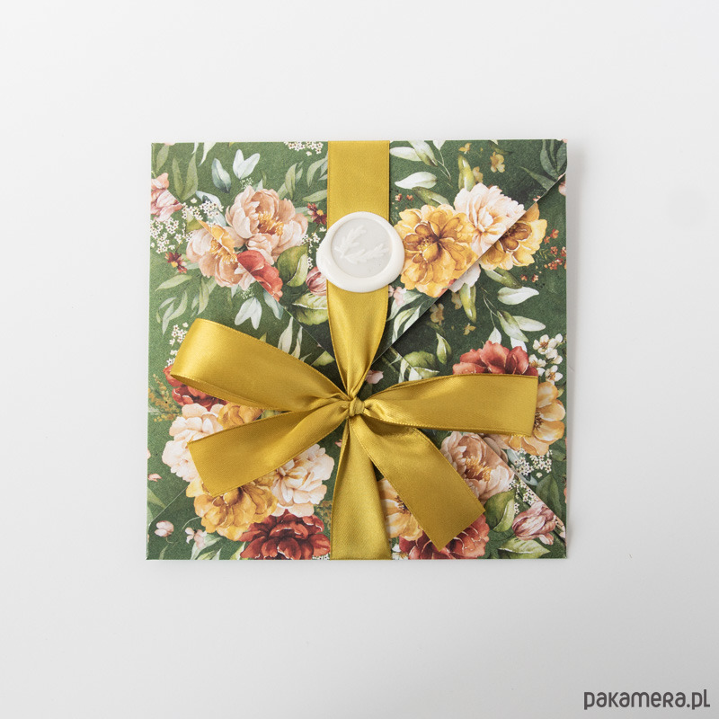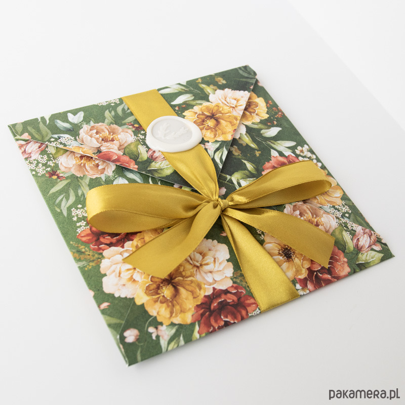 Ręcznie robiona koperta, przewiązana tasiemką, po rozwiązaniu kokardy otwiera się tworząc dużą kartę z miejscem na pieniądze (ozdobna kieszonka na lewym skrzydełku kartki pozwala na wsunięcie poskładanych banknotów).