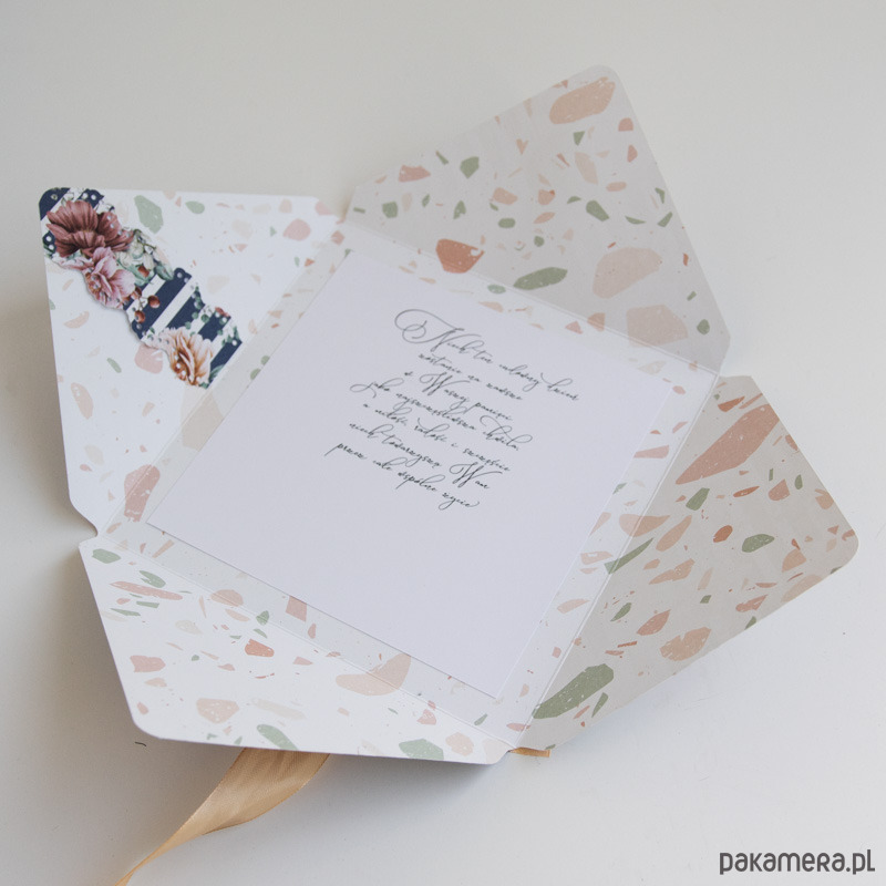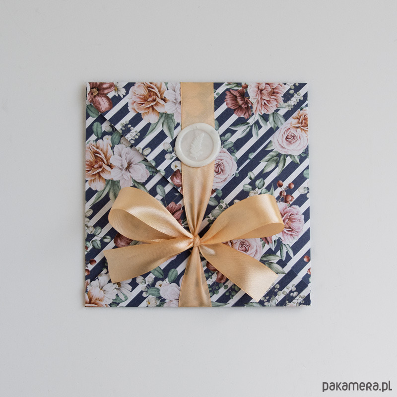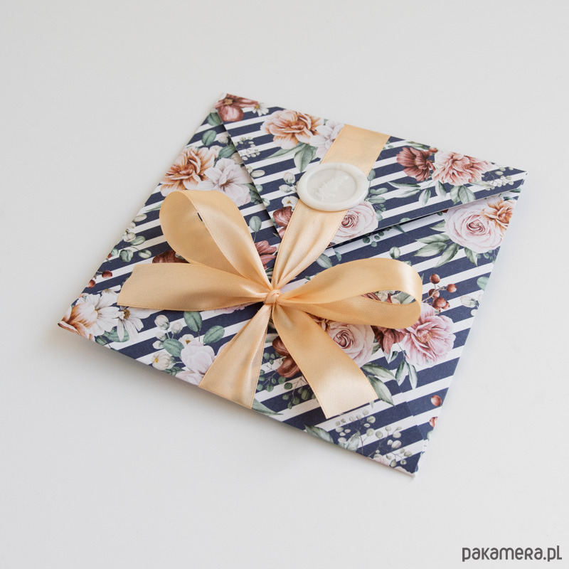 Ręcznie robiona koperta, przewiązana tasiemką, po rozwiązaniu kokardy otwiera się tworząc dużą kartę z miejscem na pieniądze (ozdobna kieszonka na lewym skrzydełku kartki pozwala na wsunięcie poskładanych banknotów).