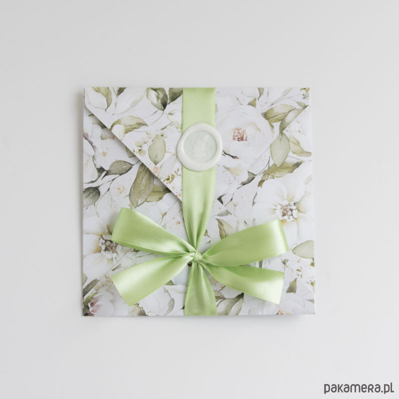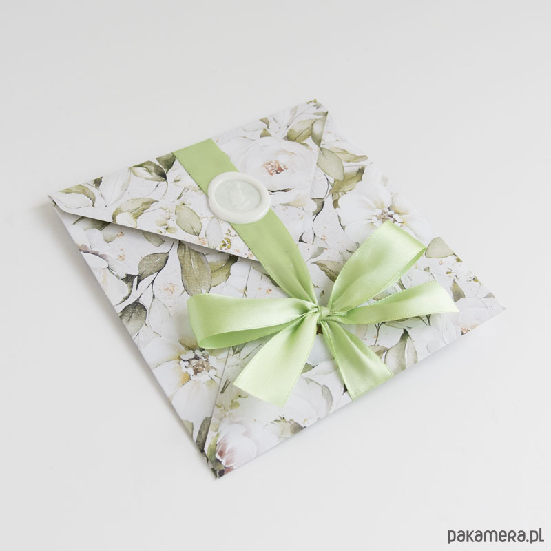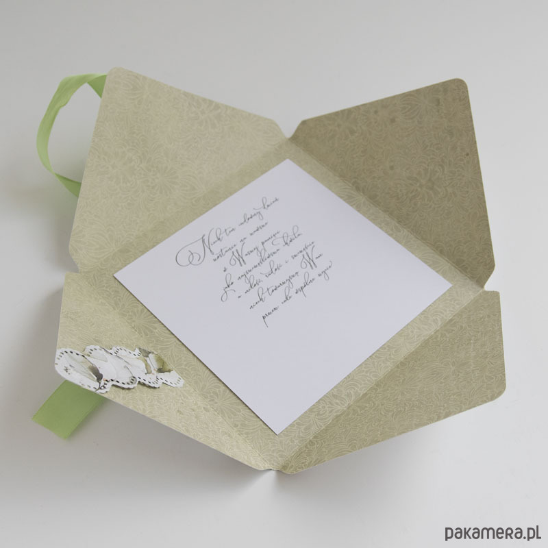 Ręcznie robiona koperta, przewiązana tasiemką, po rozwiązaniu kokardy otwiera się tworząc dużą kartę z miejscem na pieniądze (ozdobna kieszonka na lewym skrzydełku kartki pozwala na wsunięcie poskładanych banknotów).