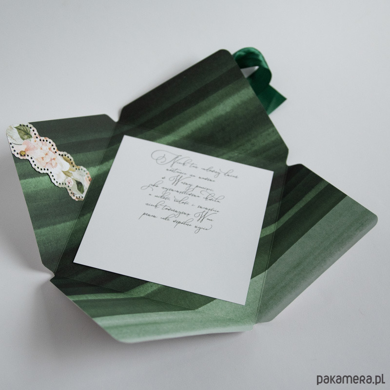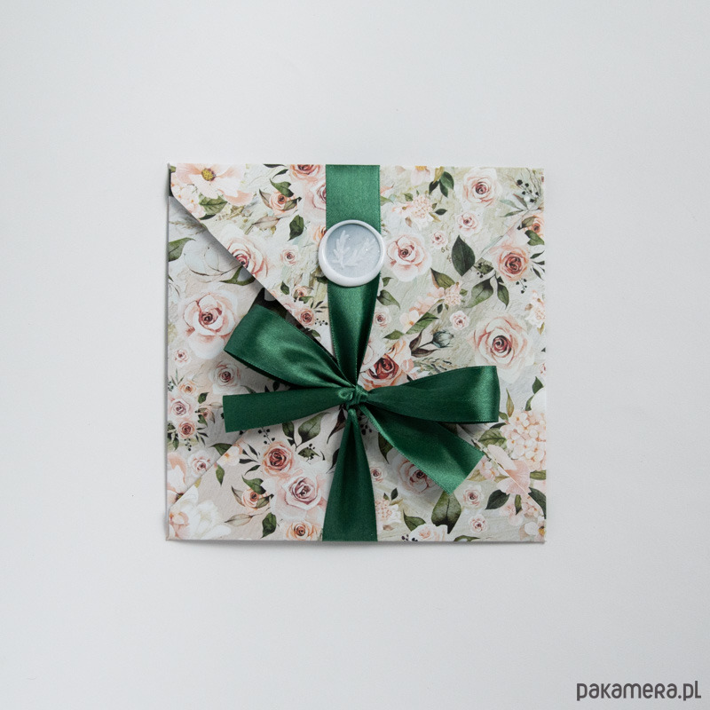 Ręcznie robiona koperta, przewiązana tasiemką, po rozwiązaniu kokardy otwiera się tworząc dużą kartę z życzeniami oraz miejscem na pieniądze (ozdobna kieszonka na lewym skrzydełku kartki pozwala na wsunięcie poskładanych banknotów).