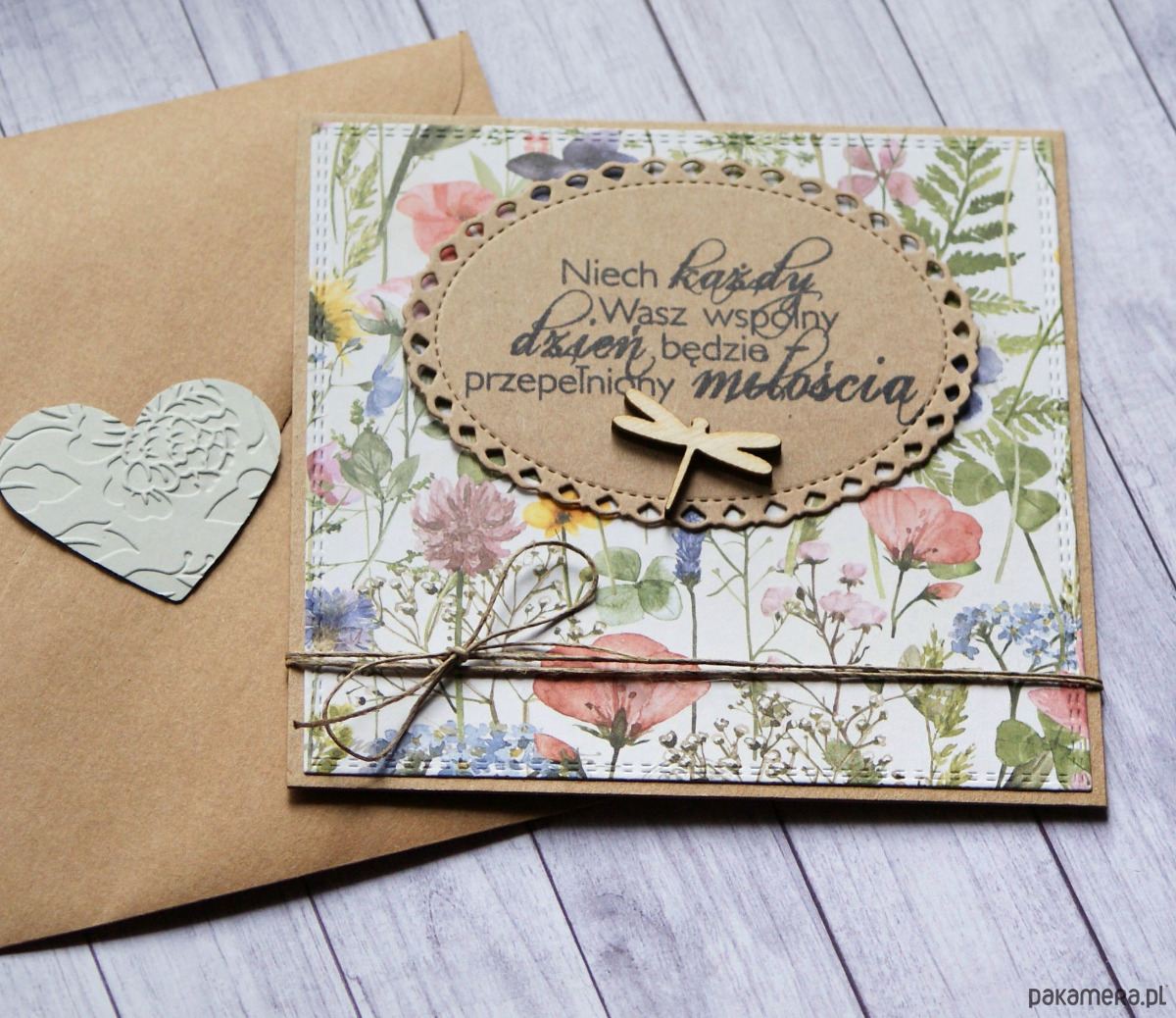 cudna kartka wykonana na bazie grubego kartonu EKO-kraft (100% makulatury), ozdobiona wzorzystym papierem (z efektem postarzania), elementami przestrzennymi i stemplowanym napisem z drewnianą ważką. przewiązana sznurkiem jutowym.