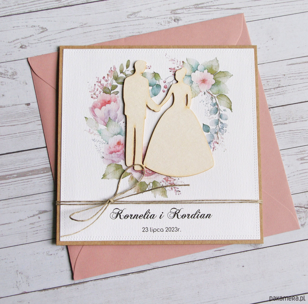 Kartka ślubna, PERSONALIZACJA, kolorowa koperta : róż