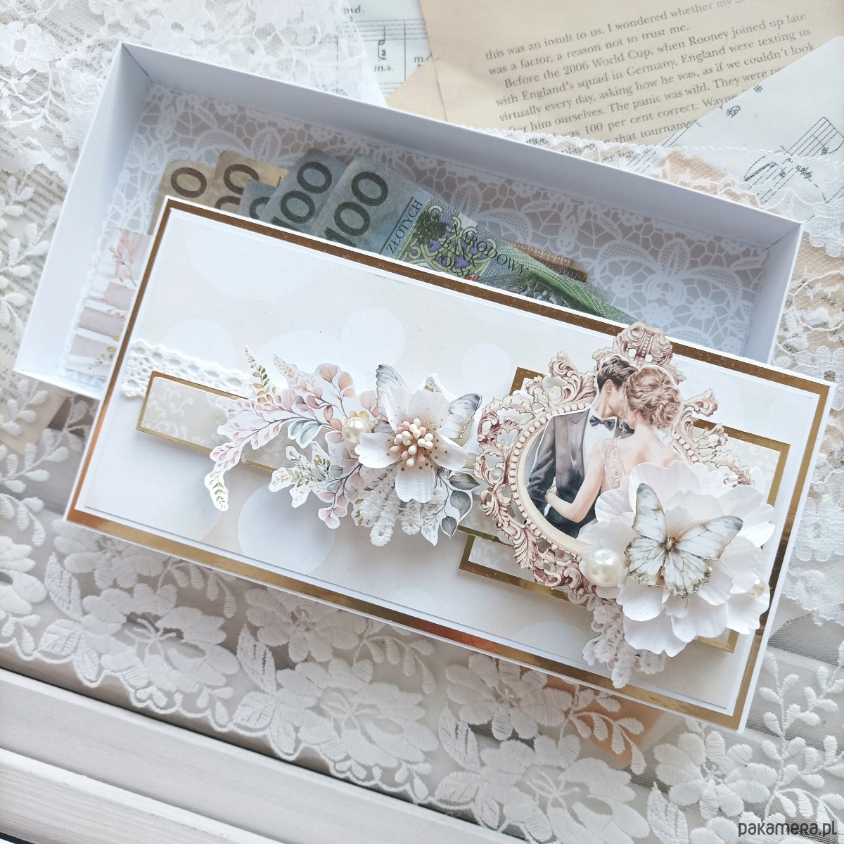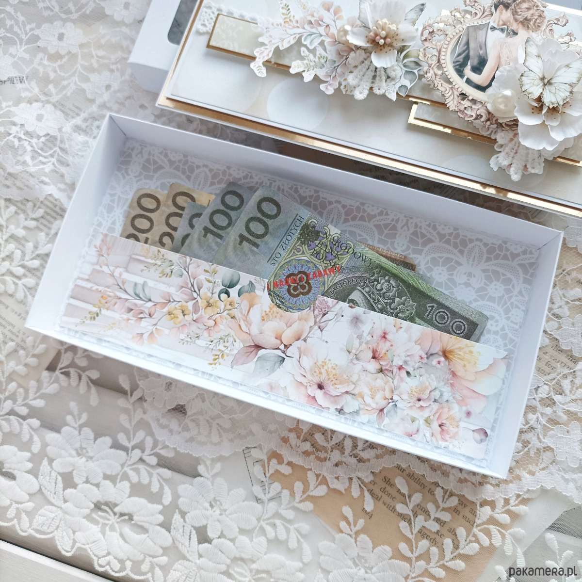 Na dno pudełeczka, do dedykowanej kieszonki możesz umieścić prezent w postaci gotówki.