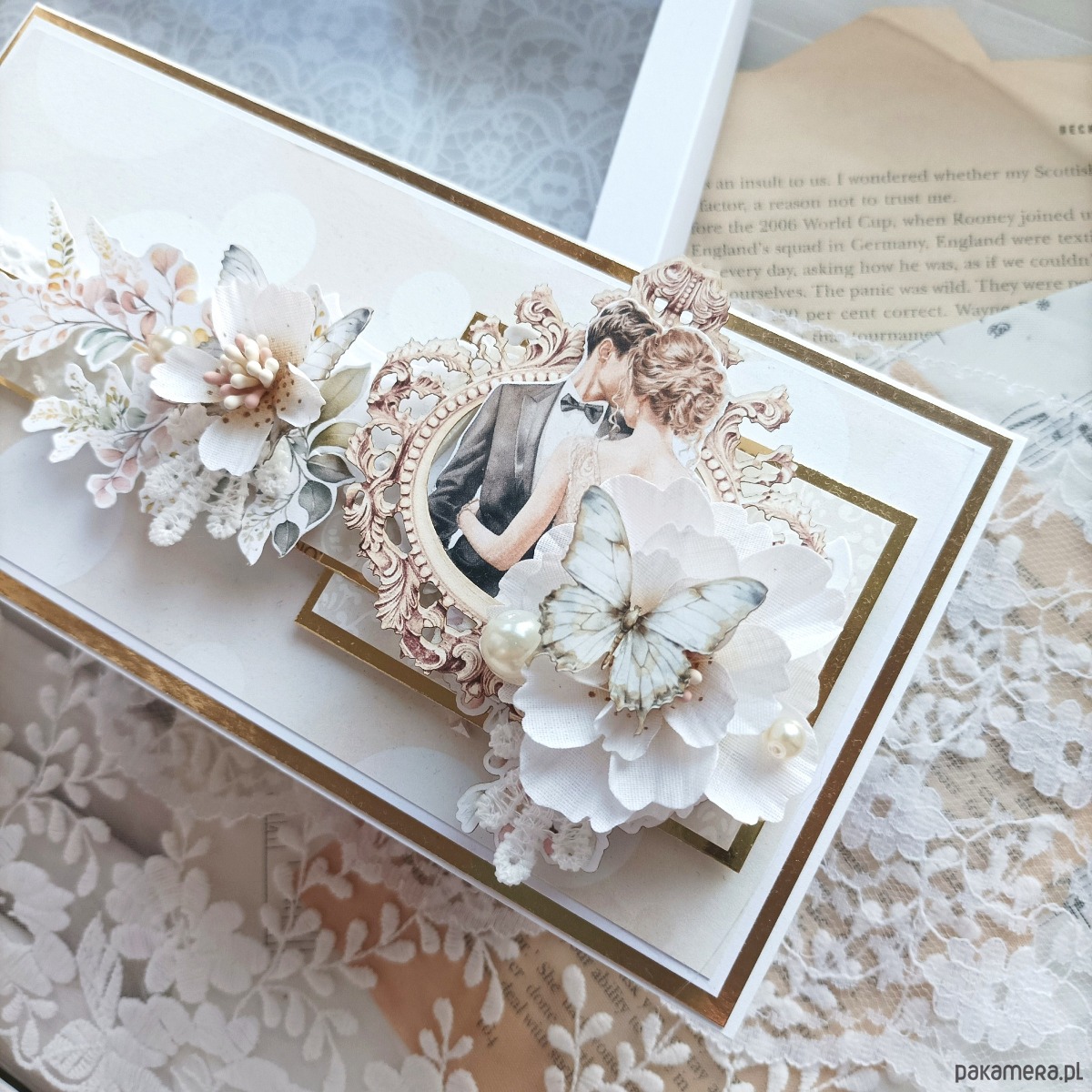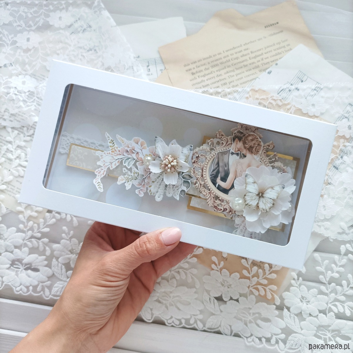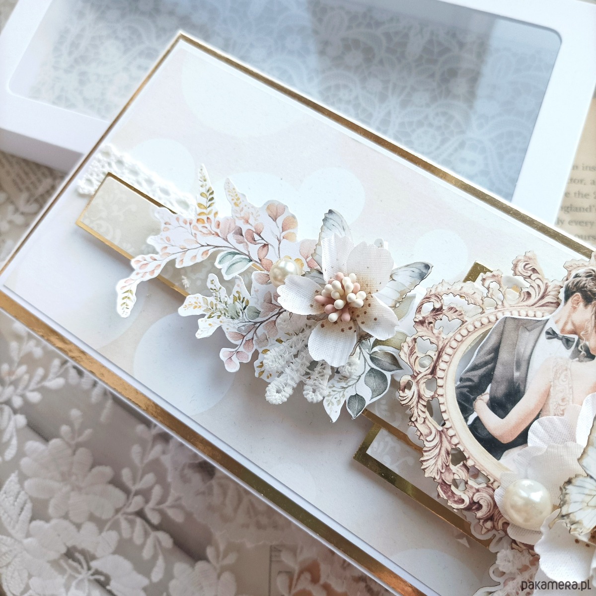 Kartka ręcznie robiona, którą teraz oglądasz została stworzona z wielką miłością i sercem. Idealna do wręczenia Parze Młodej podczas składania życzeń. Możesz wpisać do niej ręcznie życzenia, lub wkleić gotowy tekst, wcześniej wydrukowany na wysokiej jakości papierze. Aby wszystko pięknie wyglądało, kartkę pakuję w eleganckie białe pudełeczko i przewiązuję wstążką.
