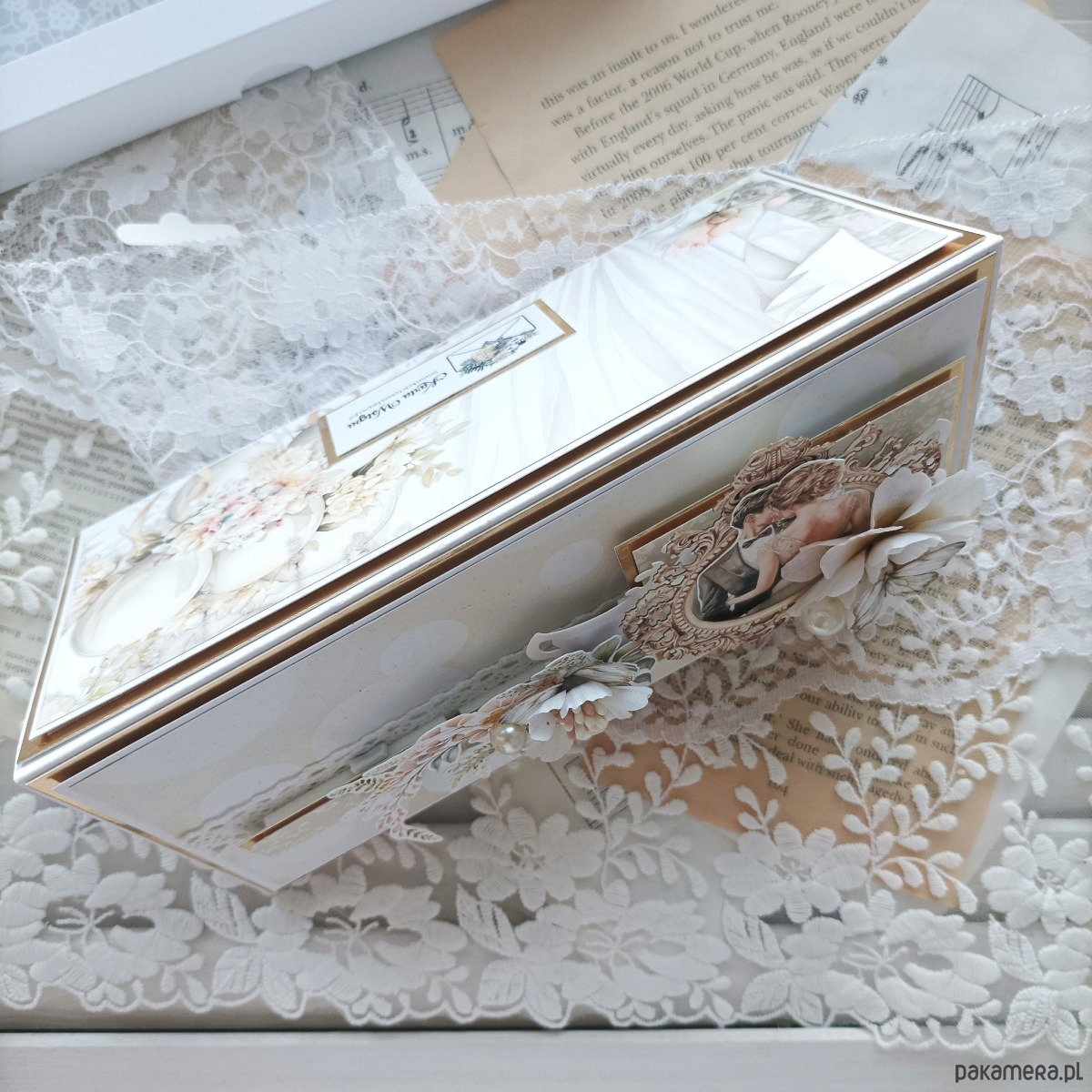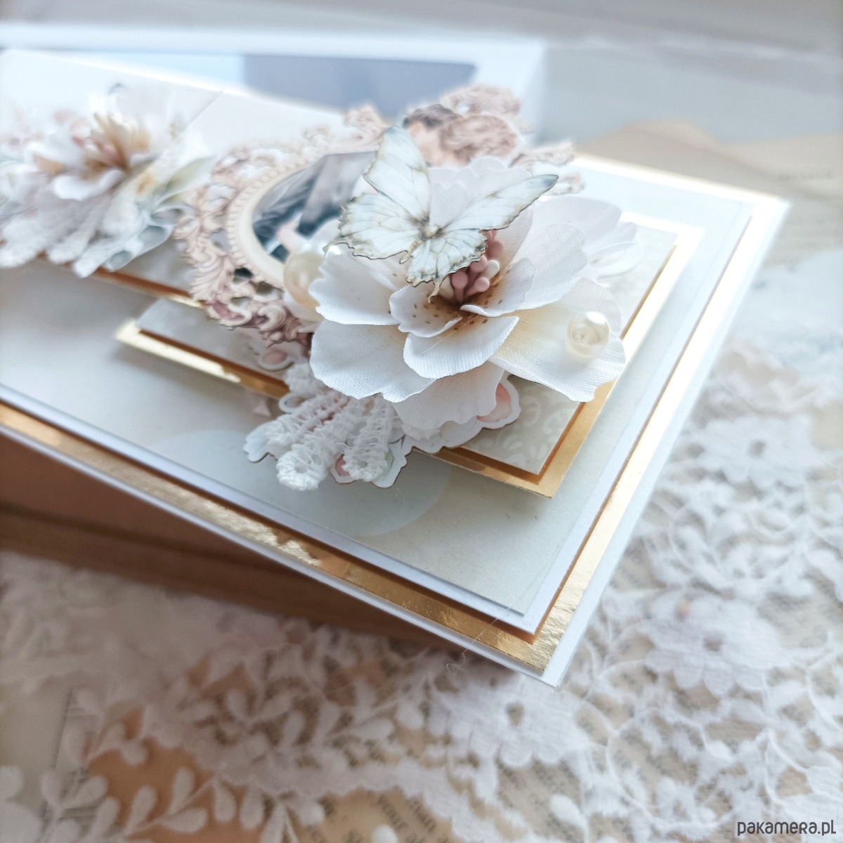 Króluje na niej bogato zdobiona kompozycja, która jest znakiem rozpoznawczym mojej marki. Umieściłam na niej ręcznie robione kwiaty, koronki, drobniutkie gałązki oraz ozdoby.