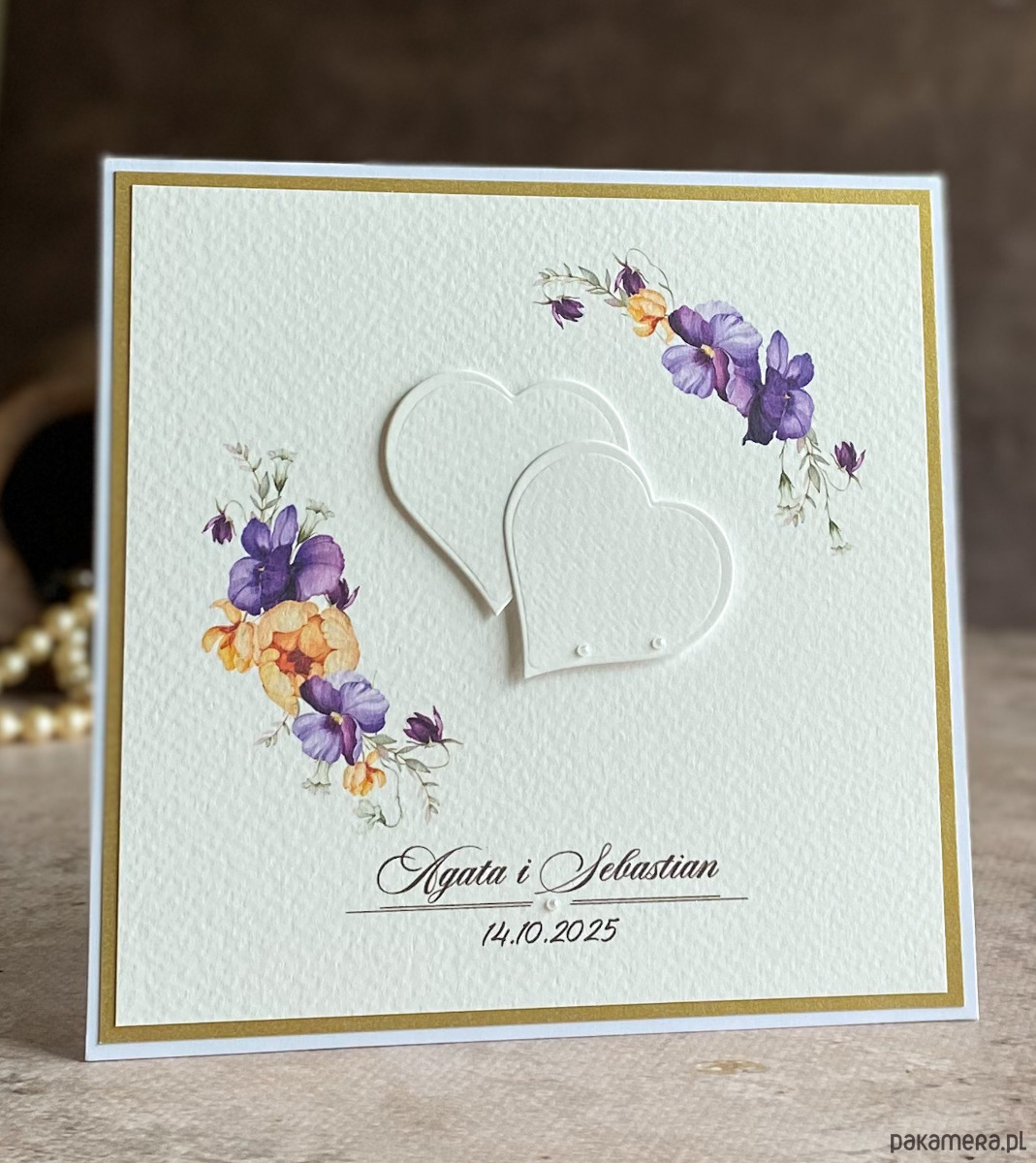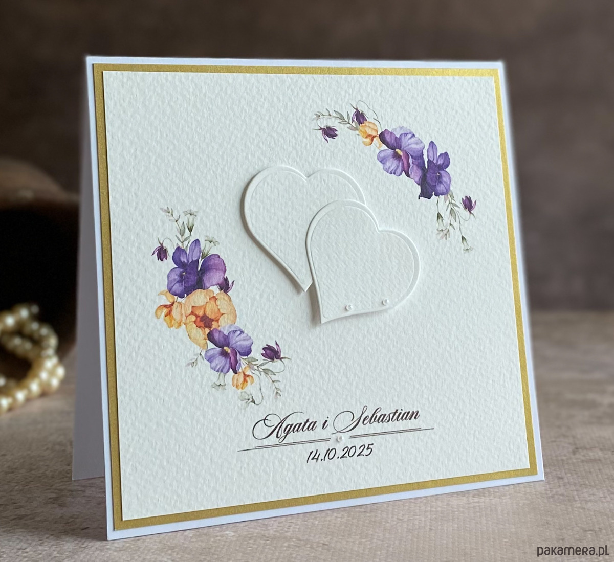 Elegancka, ręcznie wykonana kartka z okazji ślubu w ozdobnej kopercie z naszej autorskiej kolekcji WEDDING CHARM, linia ALLURE.