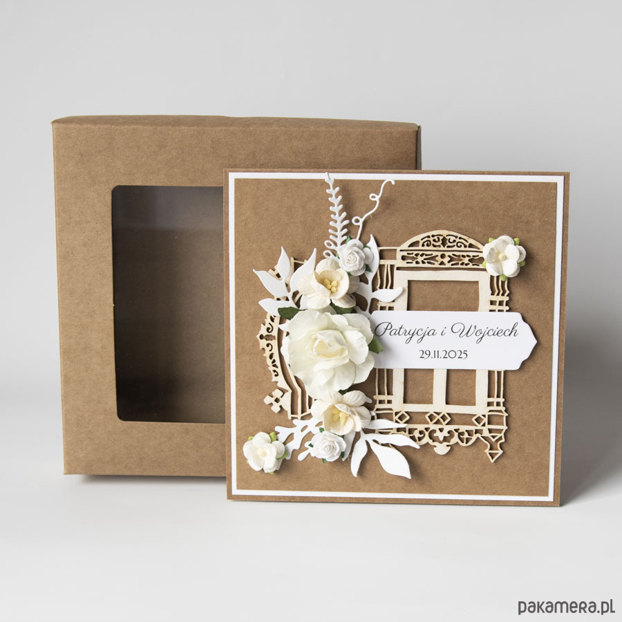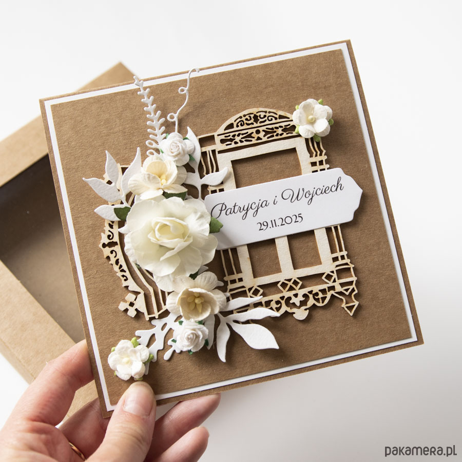 Ręcznie robiona kartka ślubna w komplecie z pudełeczkiem. Kartka utrzymana jest w naturalnej kolorystyce, zdobiona jest kompozycją eleganckich ornamentów i papierowych kwiatów.