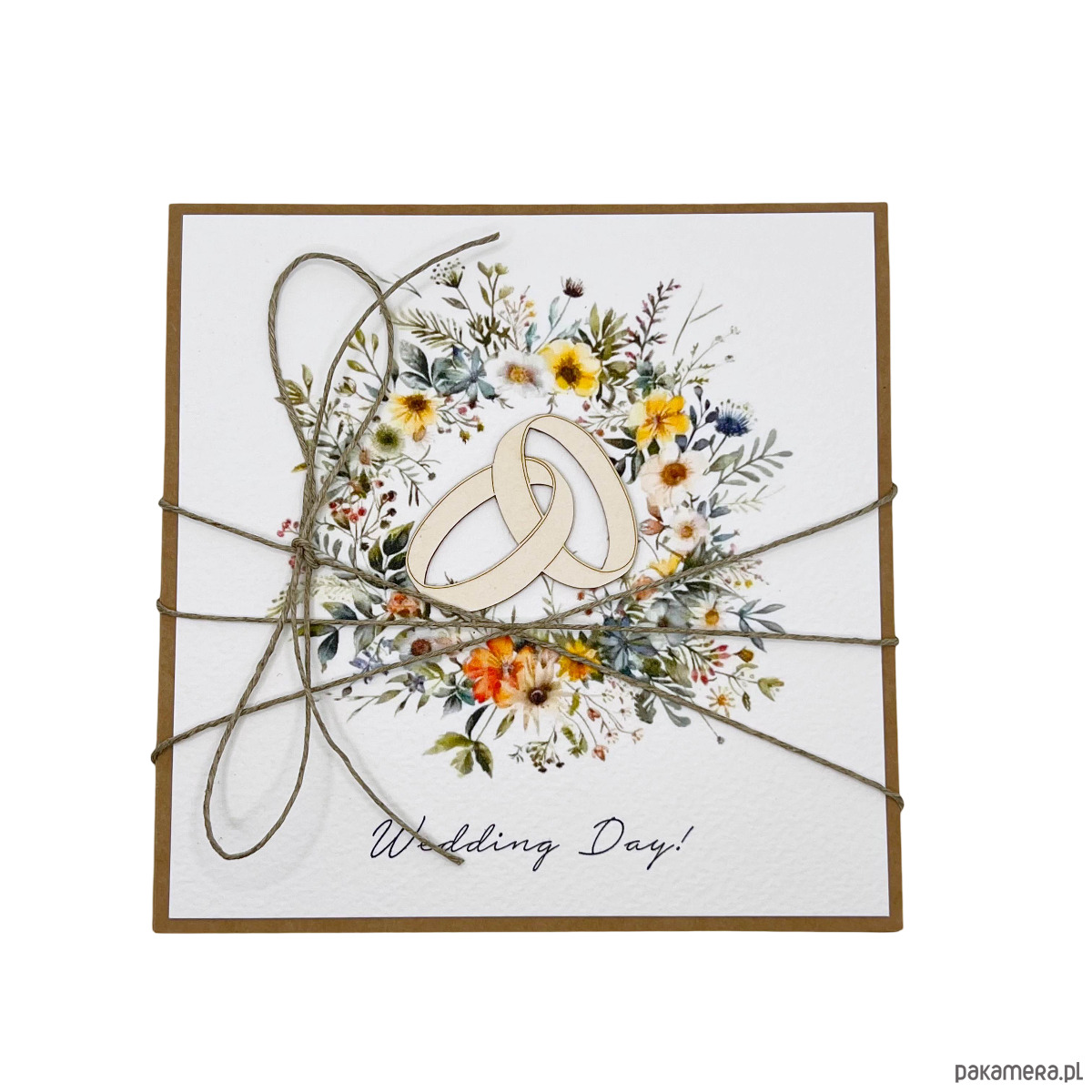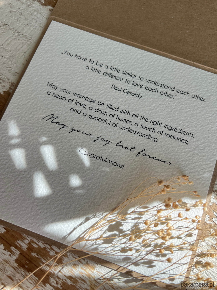Kartka ślubna wykonana jest na bazie papieru kraftowego z użyciem starannie wyselekcjonowanego papieru bawełnianego w odcieniu śmietanki oraz ozdoby tekturkowej. Kartka przewiązana jest lnianym sznureczkiem.