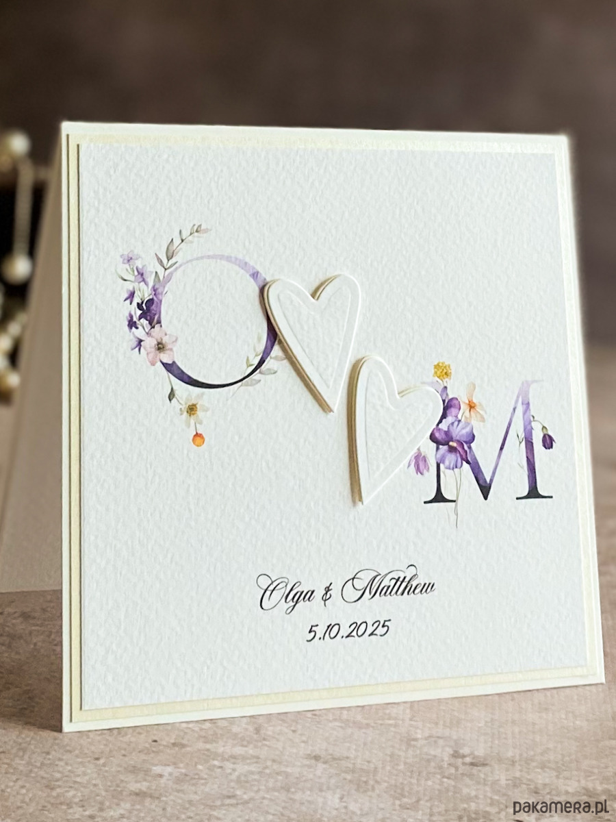 Subtelny i delikatny zestaw z kwiatowymi inicjałami młodej pary, ręcznie wyciętym dekorem oraz ręcznie zdobioną kopertą.