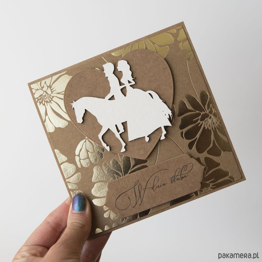 Kartka ślubna z parą młodą na koniu