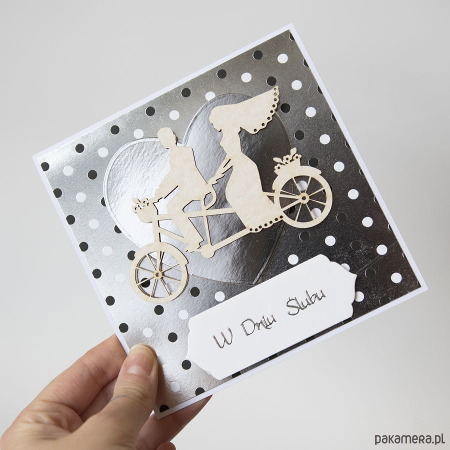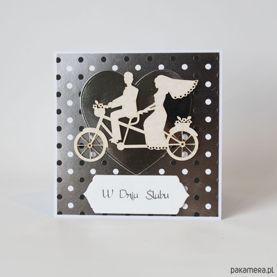 Kartka ślubna z parą młodą na rowerze