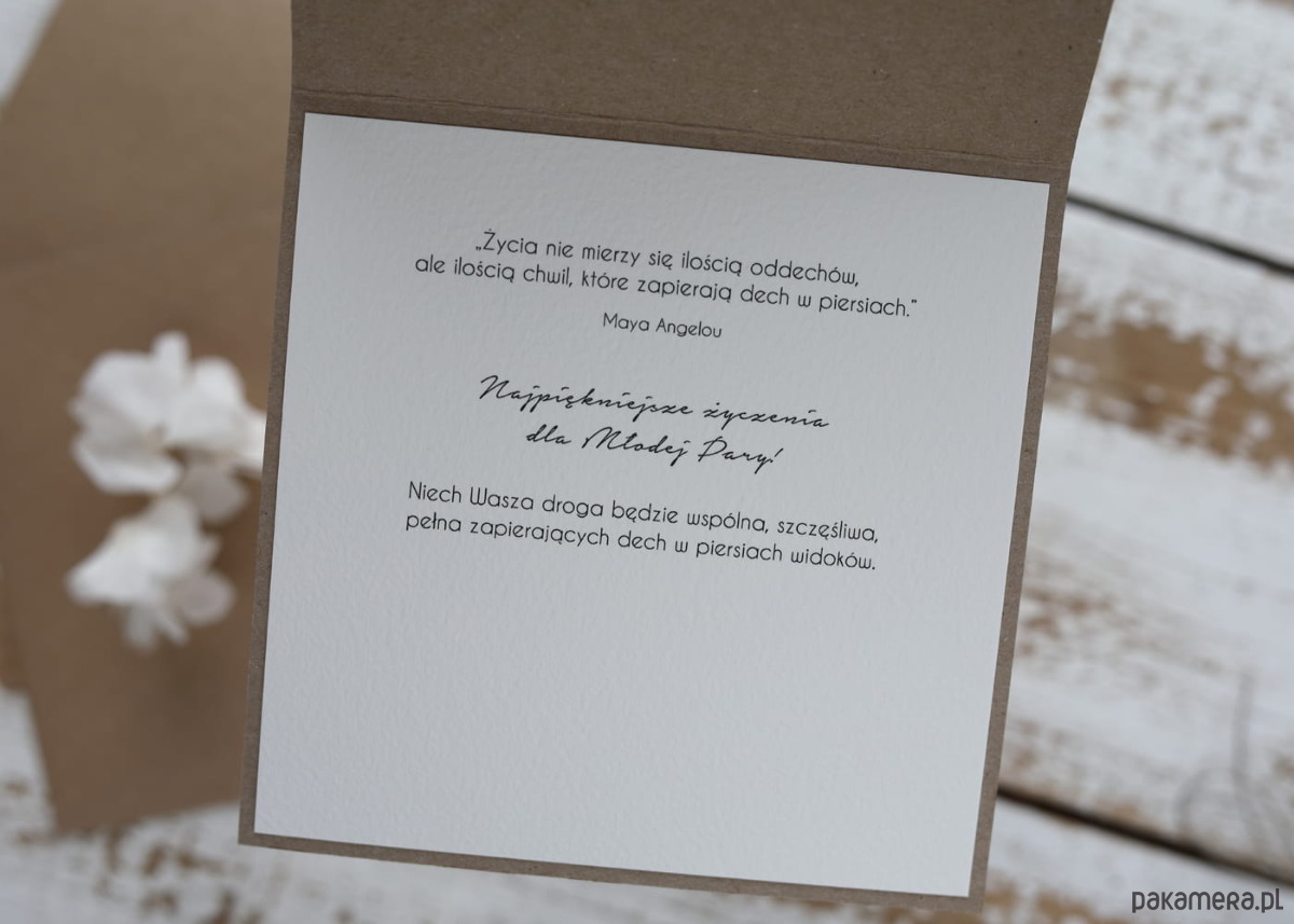 Kartka na ślub o wymiarach ok. 14x14 cm wykonana jest z papieru kraftowego oraz papieru bawełnianego z użyciem ozdoby tekturkowej. Kartka otwierana do góry, w środku wklejona jest kartka z papieru bawełnianego z życzeniami bądź gotowa do wpisania życzeń własnoręcznie.