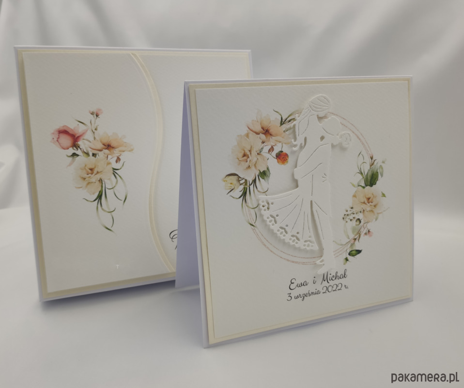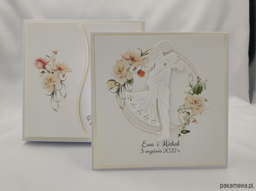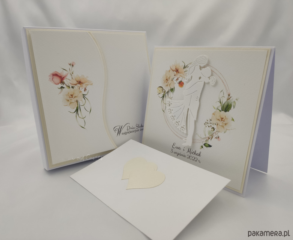 Elegancka, ręcznie wykonana kartka z okazji ślubu w pudełku z ozdobną kopertą na pieniądze, voucher podarunkowy lub drobny upominek. Zestaw z delikatną, kwiatową grafiką i subtelnym dekorem.