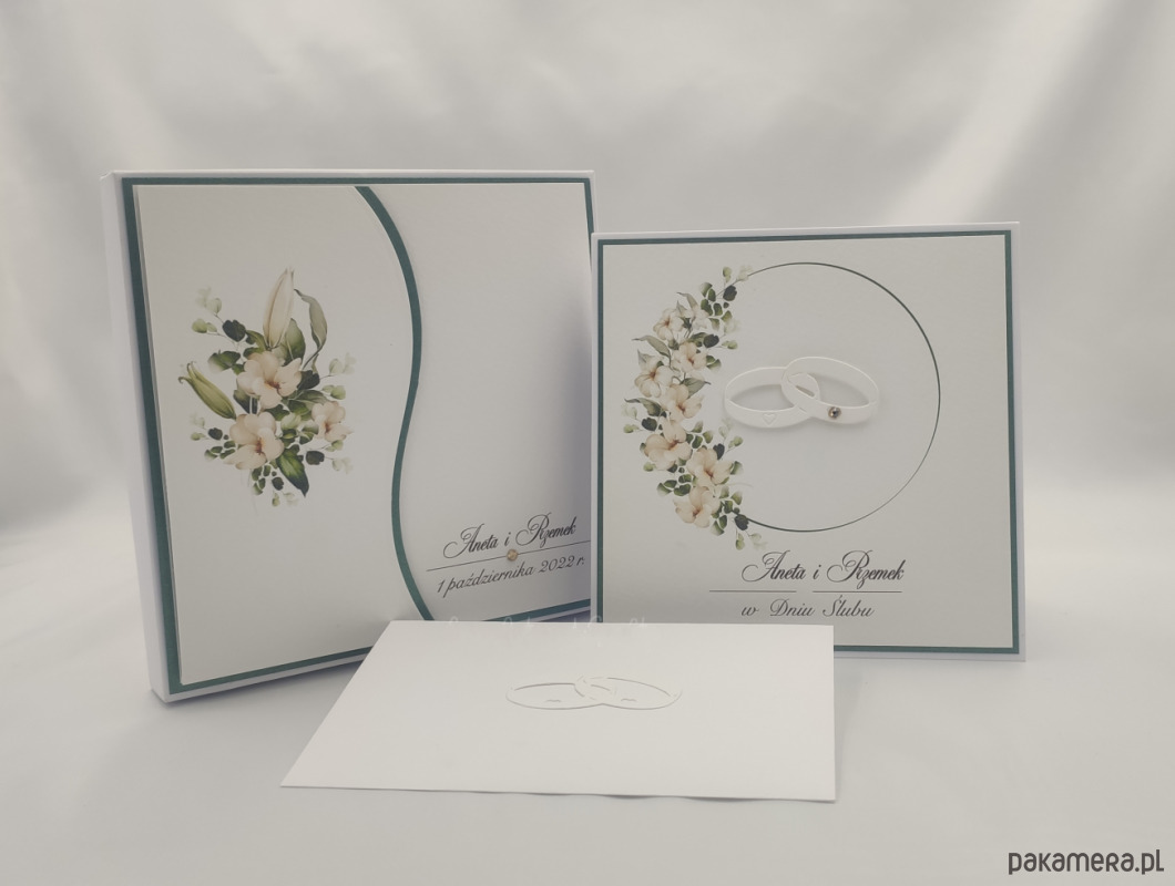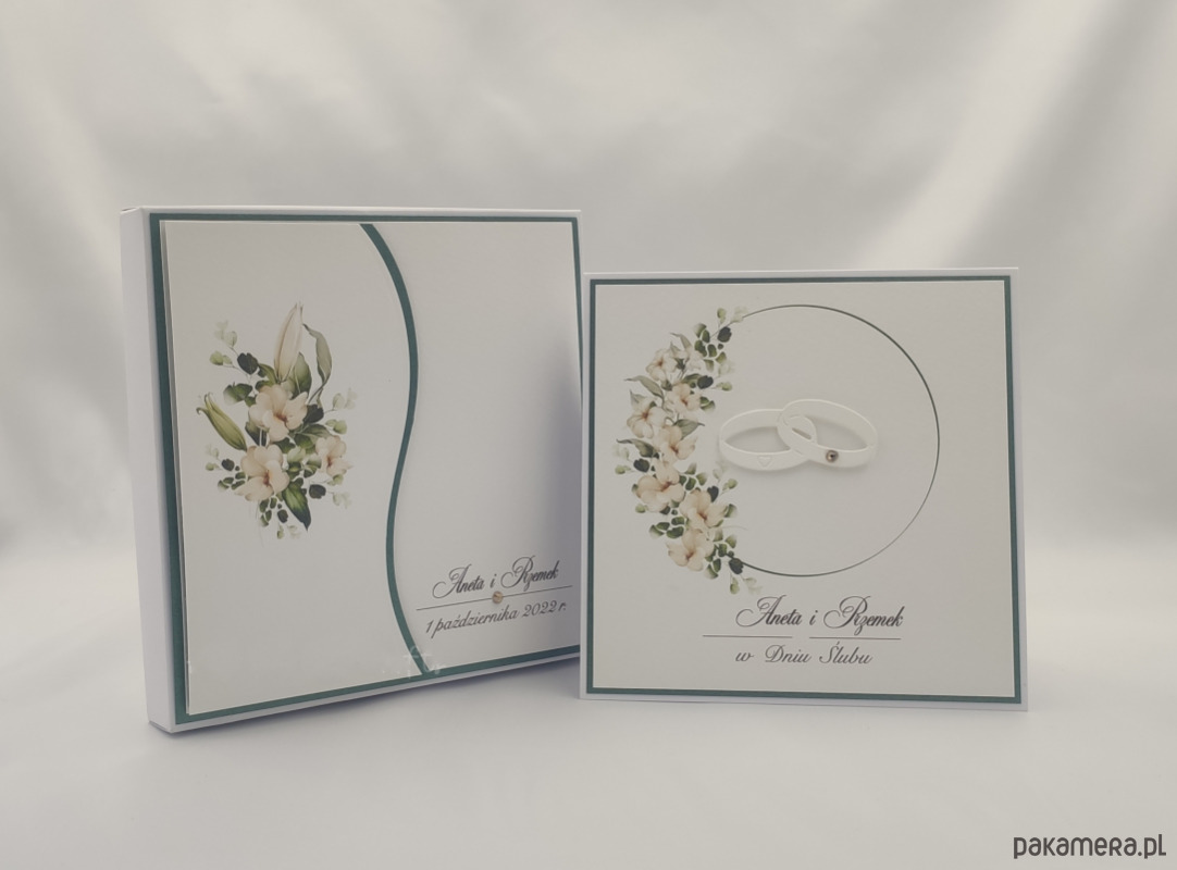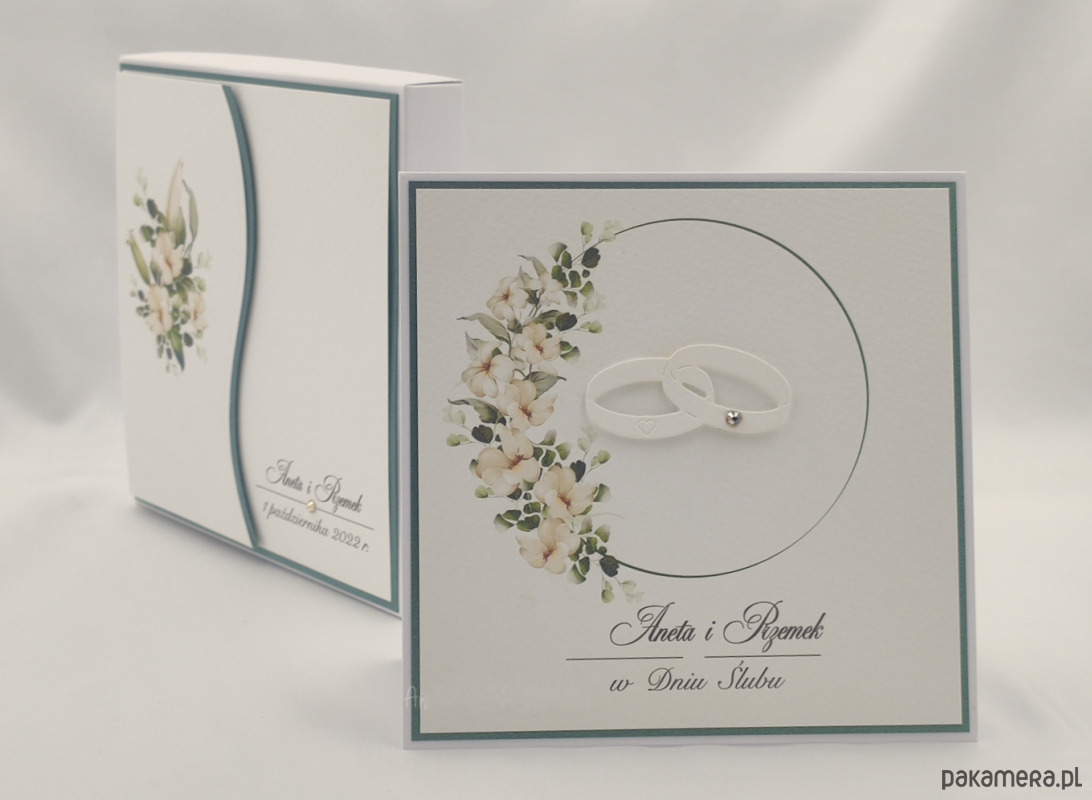 Elegancka, ręcznie wykonana kartka z okazji ślubu w pudełku z ozdobną kopertą na pieniądze lub drobny upominek.