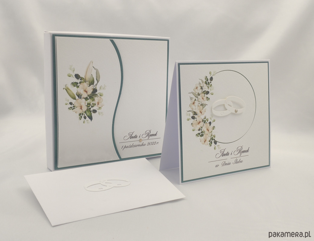 Kartka o wymiarze 14x14 cm otwiera się ku górze, w skład zestawu wchodzi pudełko, ozdobna kartka z życzeniami oraz dekoracyjna koperta.