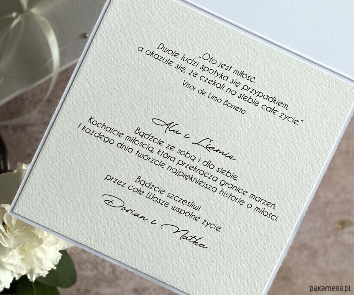 To zestawienie wyjątkowego włoskiego papieru w odcieniu delikatnej, śmietankowej bieli oraz wykończeń w odcieniu ecru. Ozdobionych ręcznie wyciętymi elementami z dodatkiem alabastrowych perełek lub delikatnych cyrkonii.