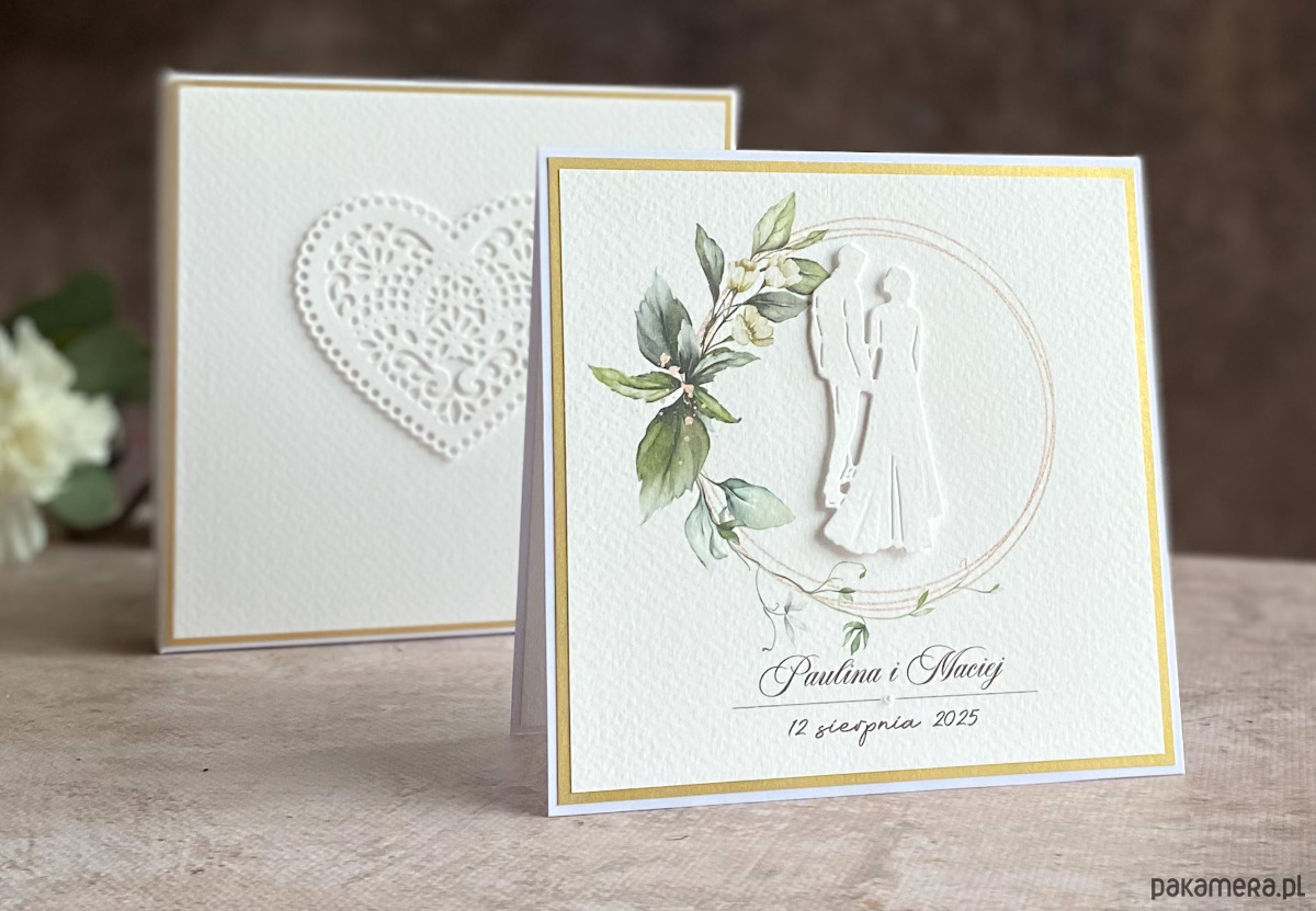 To zestawienie wyjątkowego włoskiego papieru w odcieniu delikatnej, śmietankowej bieli i wykończeń w kolorze matowego, perłowego złota. Ozdobionych ręcznie wyciętymi elementami z dodatkiem alabastrowych perełek lub delikatnych cyrkonii.