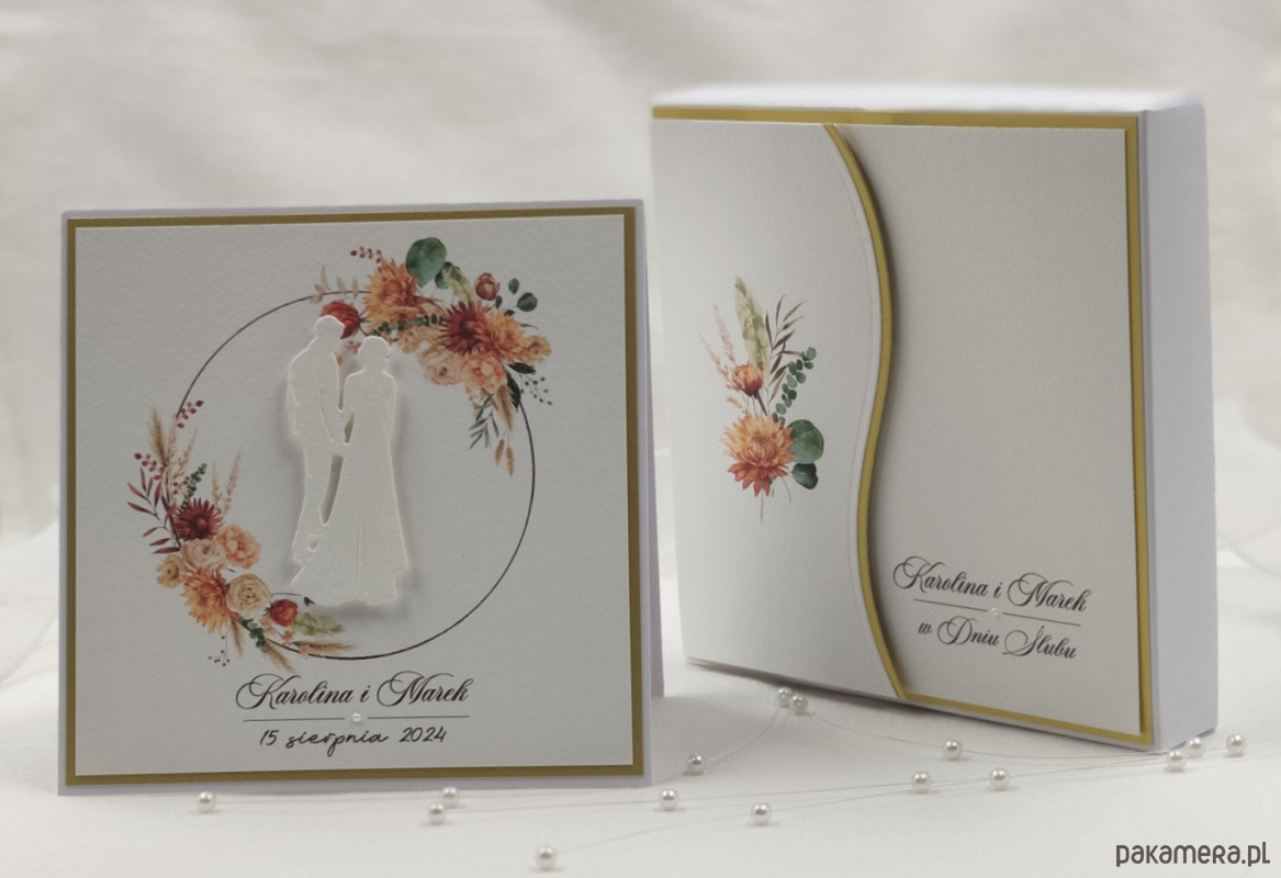 Elegancka, ręcznie wykonana kartka z okazji ślubu w pudełku z ozdobną kopertą na pieniądze lub drobny upominek.
