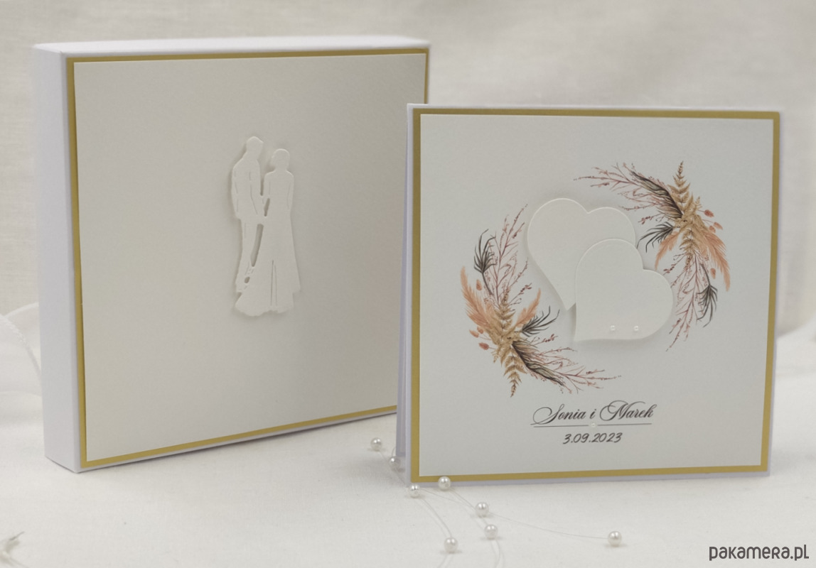 Elegancka, ręcznie wykonana kartka z okazji ślubu w pudełku z ozdobną kopertą na pieniądze lub drobny upominek.