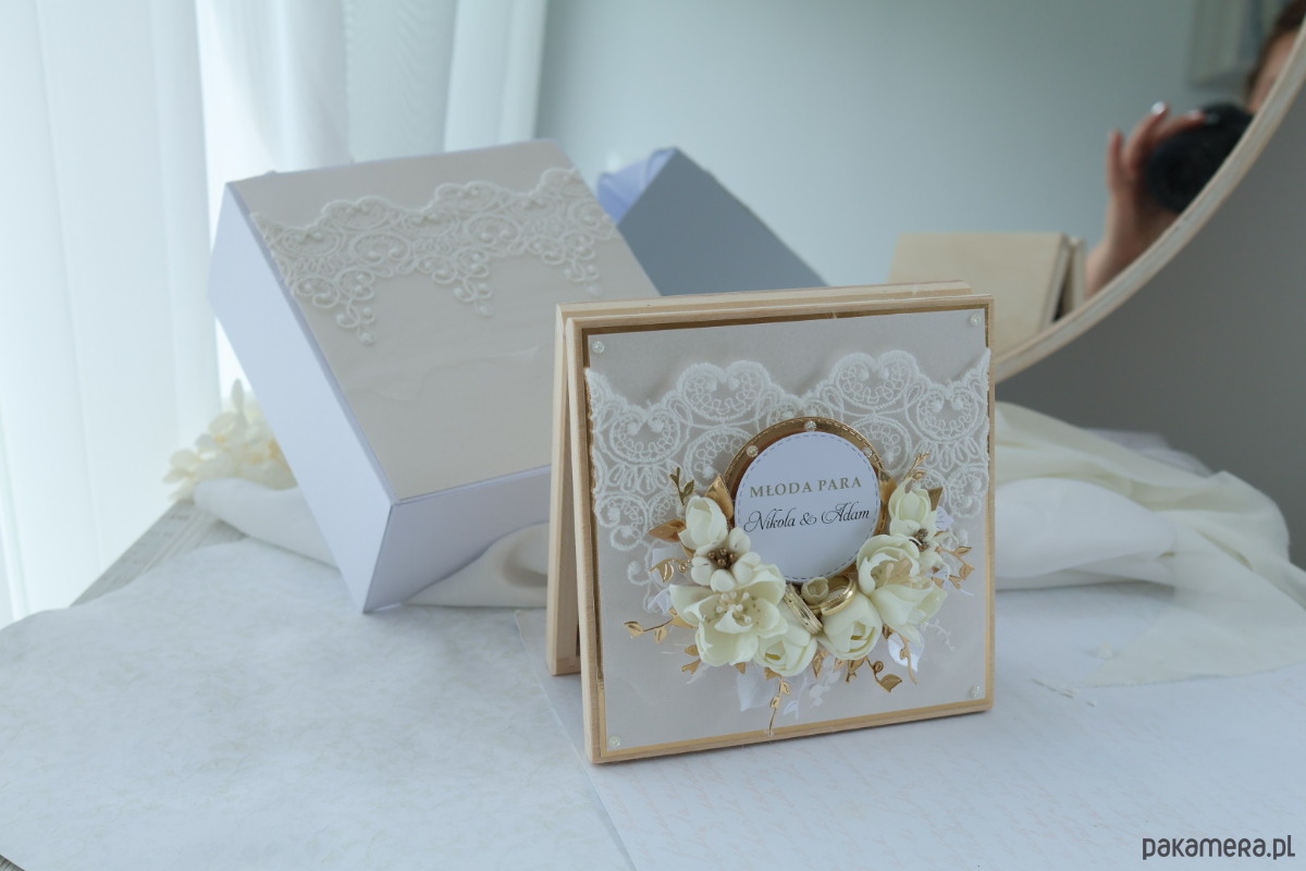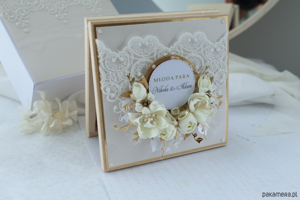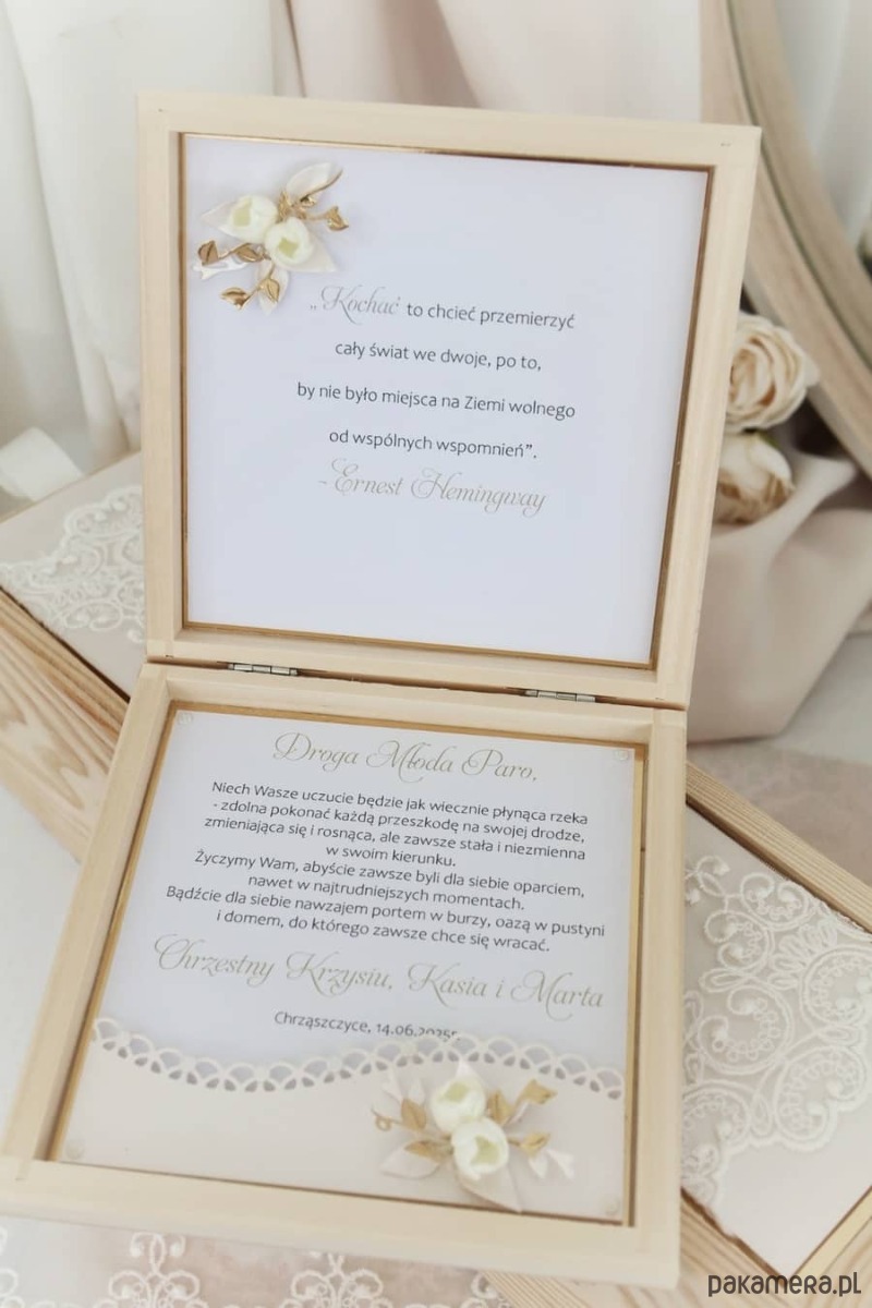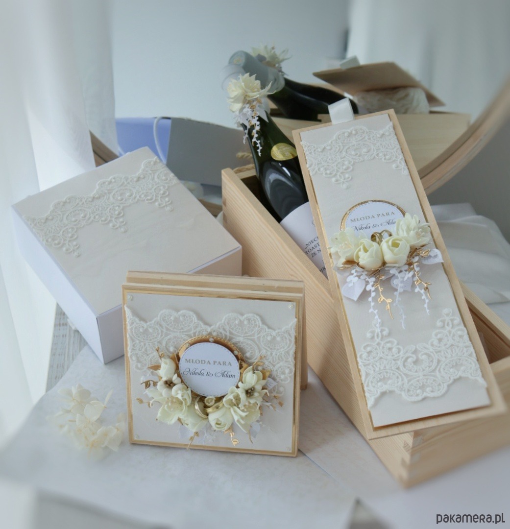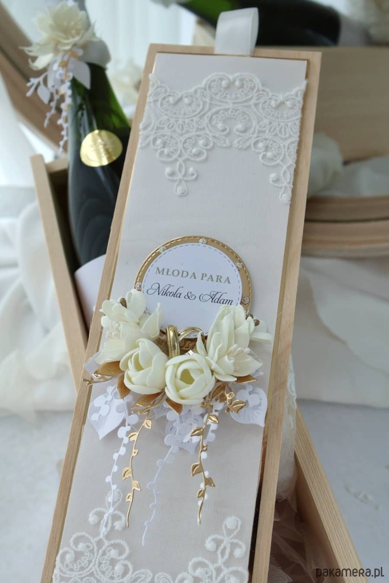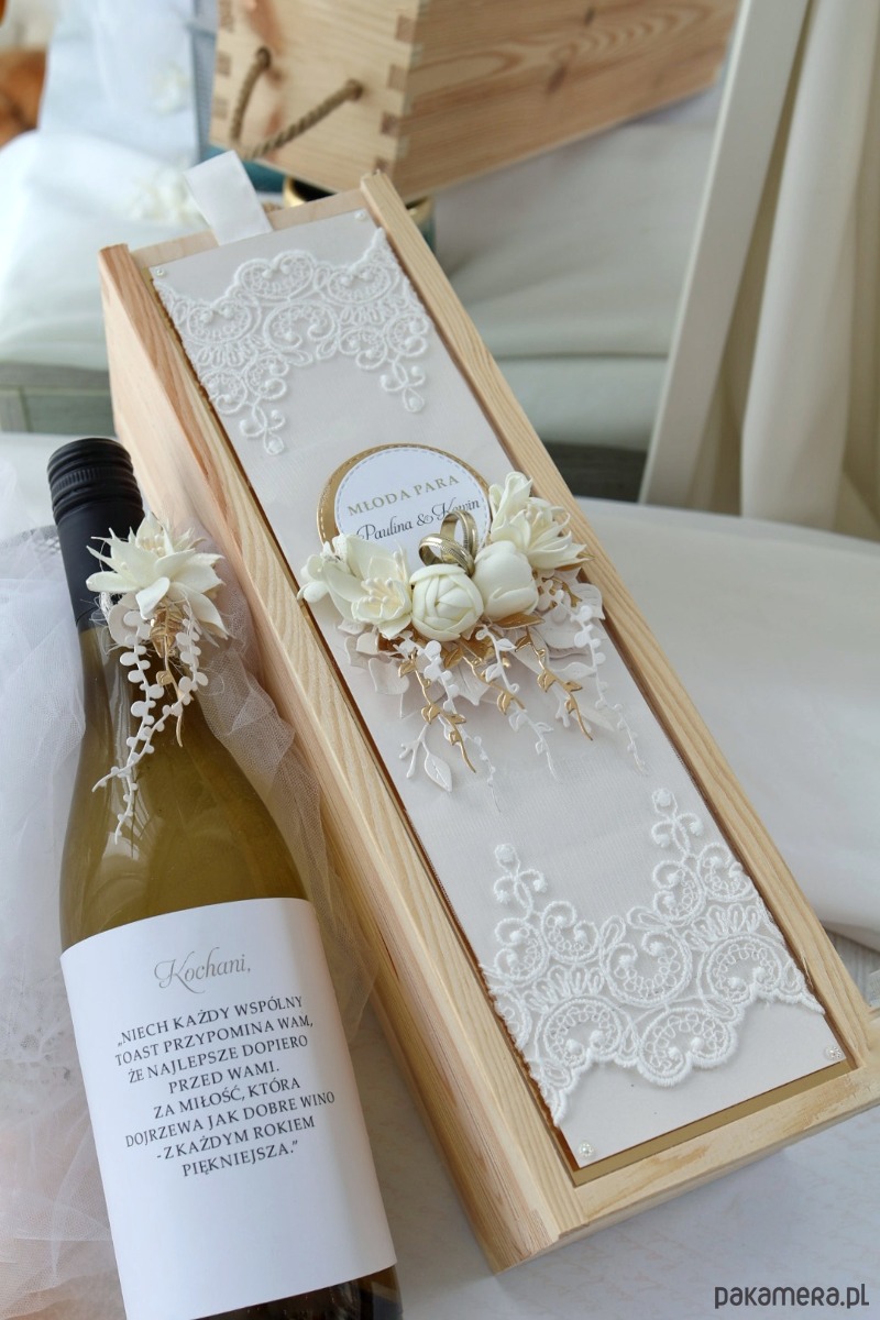 – ręcznie wykonana, personalizowana kartka w drewnianym pudełku, drewniana skrzynka na wino (bez wina), zawieszka i etykieta z personalizacją na butelkę, elegancka torebka prezentowa, dopasowana do całości. Delikatna koronka, kremowe róże, złote detale i staranne wykończenie nadają całości subtelny, luksusowy charakter.