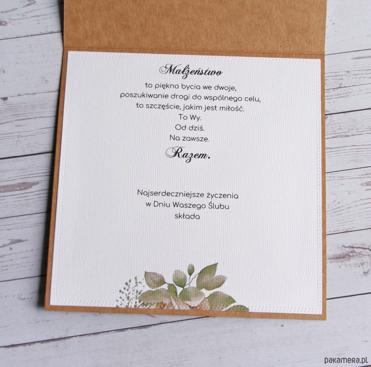 wewnątrz kartki umieszczone GOTOWE ŻYCZENIA (na zdjęciu), wydrukowane na białym papierze wizytówkowym (ten sam co na froncie). - bez możliwości modyfikacji.