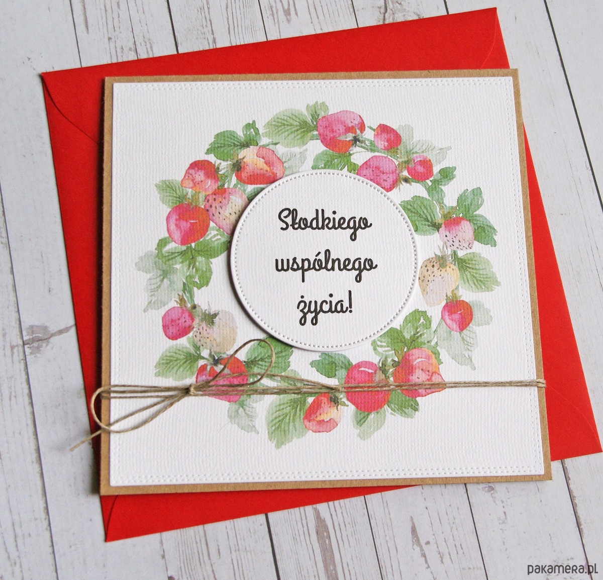 kartka wykonana na bazie grubego kartonu kraft (100% makulatury), ozdobiona papierem wizytówkowym o fakturze płótna - białym (z nadrukiem). w centrum: element przestrzenny z napisem SŁODKIEGO WSPÓLNEGO ŻYCIA. kartka przewiązana jutowym sznurkiem.