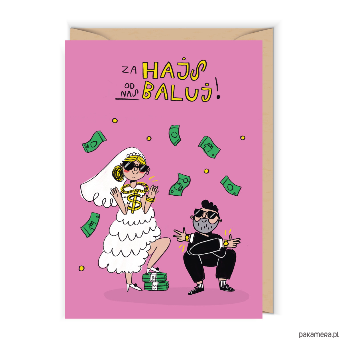 Zabawna i stylowa kartka ślubna „Za hajs baluj” od Przepiórka Pazurem! Idealna dla pary młodej z dystansem i poczuciem humoru. Różowe tło, zielone pieniądze i urocza para młoda sprawią, że ten prezent zapadnie w pamięć na długo.
