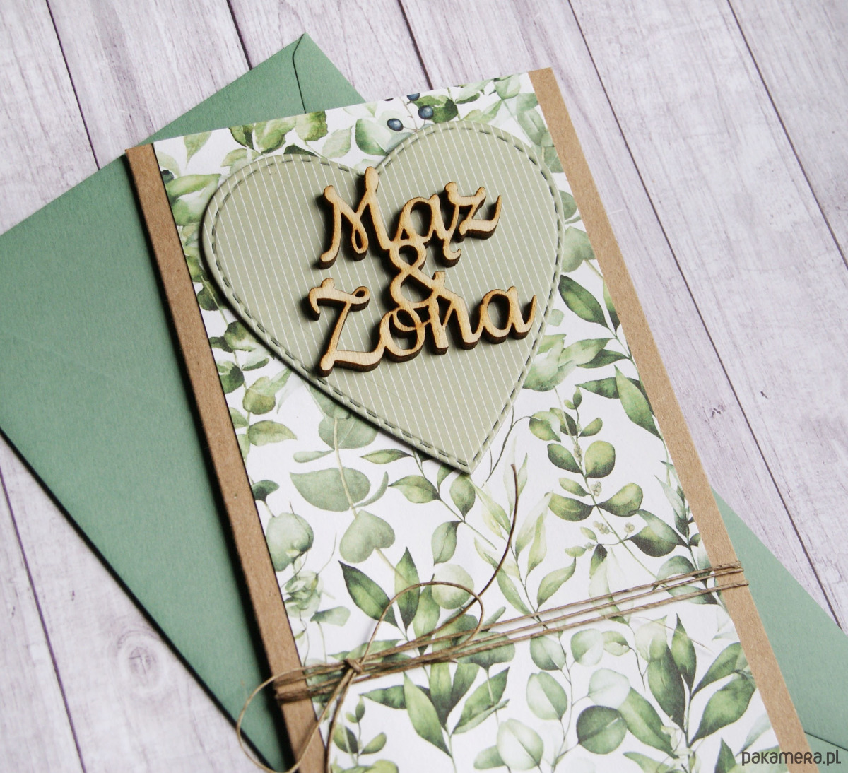 wykonana na bazie grubego kartonu EKO-kraft (100% makulatury), ozdobiona wzorzystym kartonem, elementem przestrzennym z drewnianym napisem, przewiązana sznurkiem jutowym.