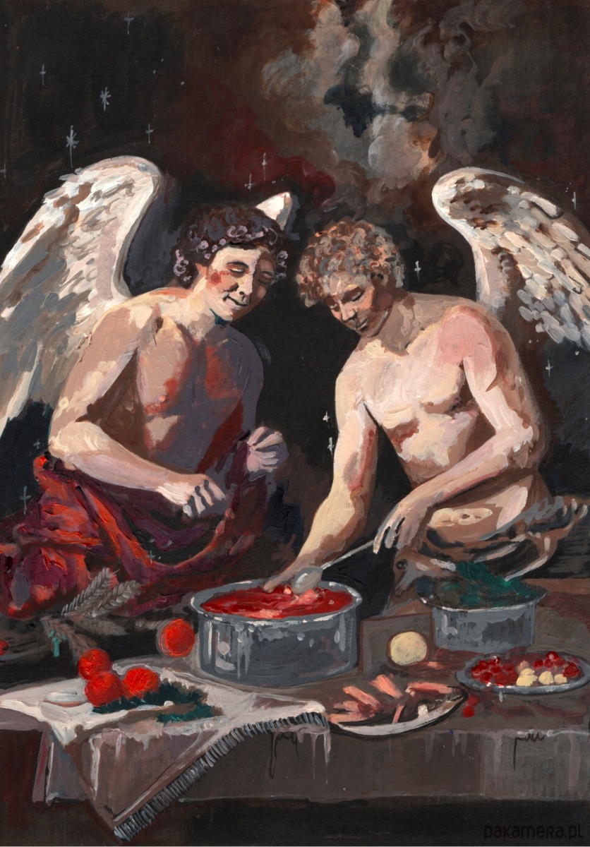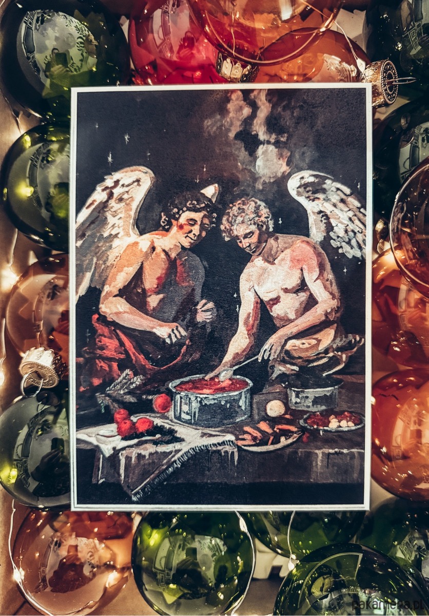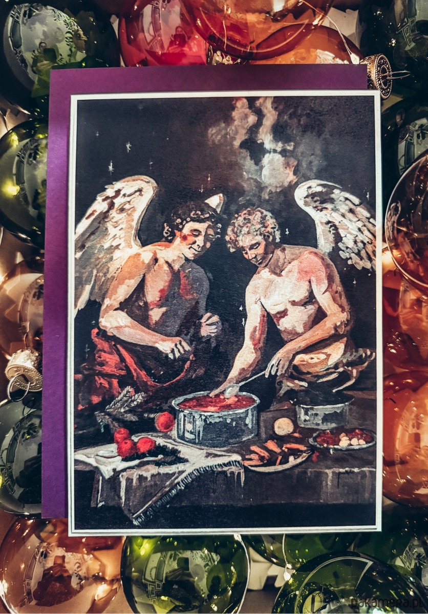 Kartka świąteczna z reprodukcją autorskiej ilustracji. Anielskie przygotowania do świąt idą pełną parą. Barszczyk już powolutku pyrkoce na kuchence.