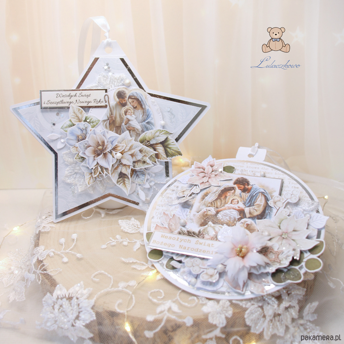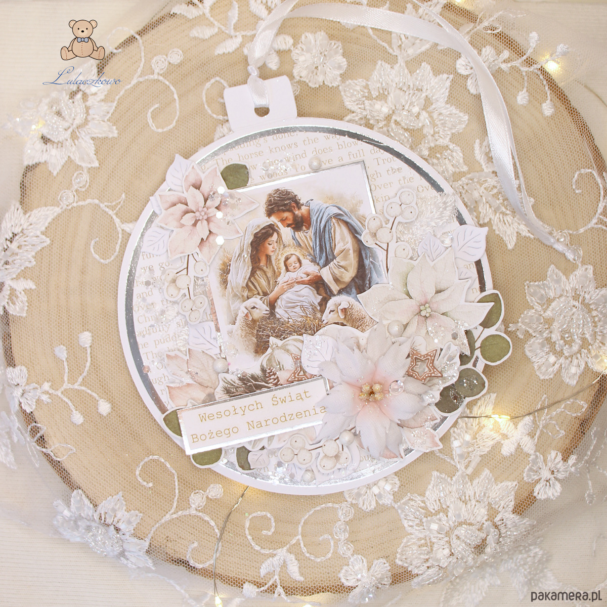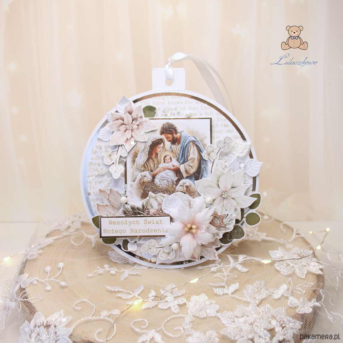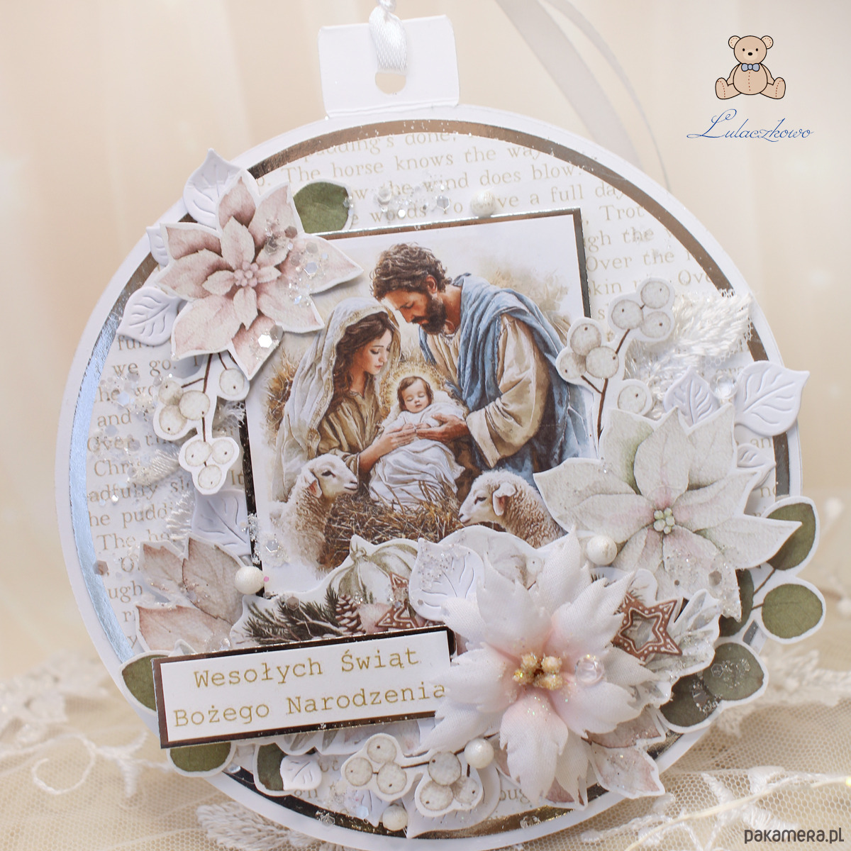 Przepiękna kartka na Boże Narodzenie w kształcie bombki i w formie zawieszki na choinkę, wykonana ręcznie, techniką scrapbookingu, z dbałością o każdy szczegół. Gwiazdka z motywem Świętej Rodziny, ozdobiona grafikami kwiatów i listeczków, ręcznie wykonaną, materiałową poinsecją, połyskującymi kryształkami oraz napisem "Wesołych Świąt Bożego Narodzenia". Elementy są klejone warstwowo, dzięki czemu kartka daje lekki efekt 3D,