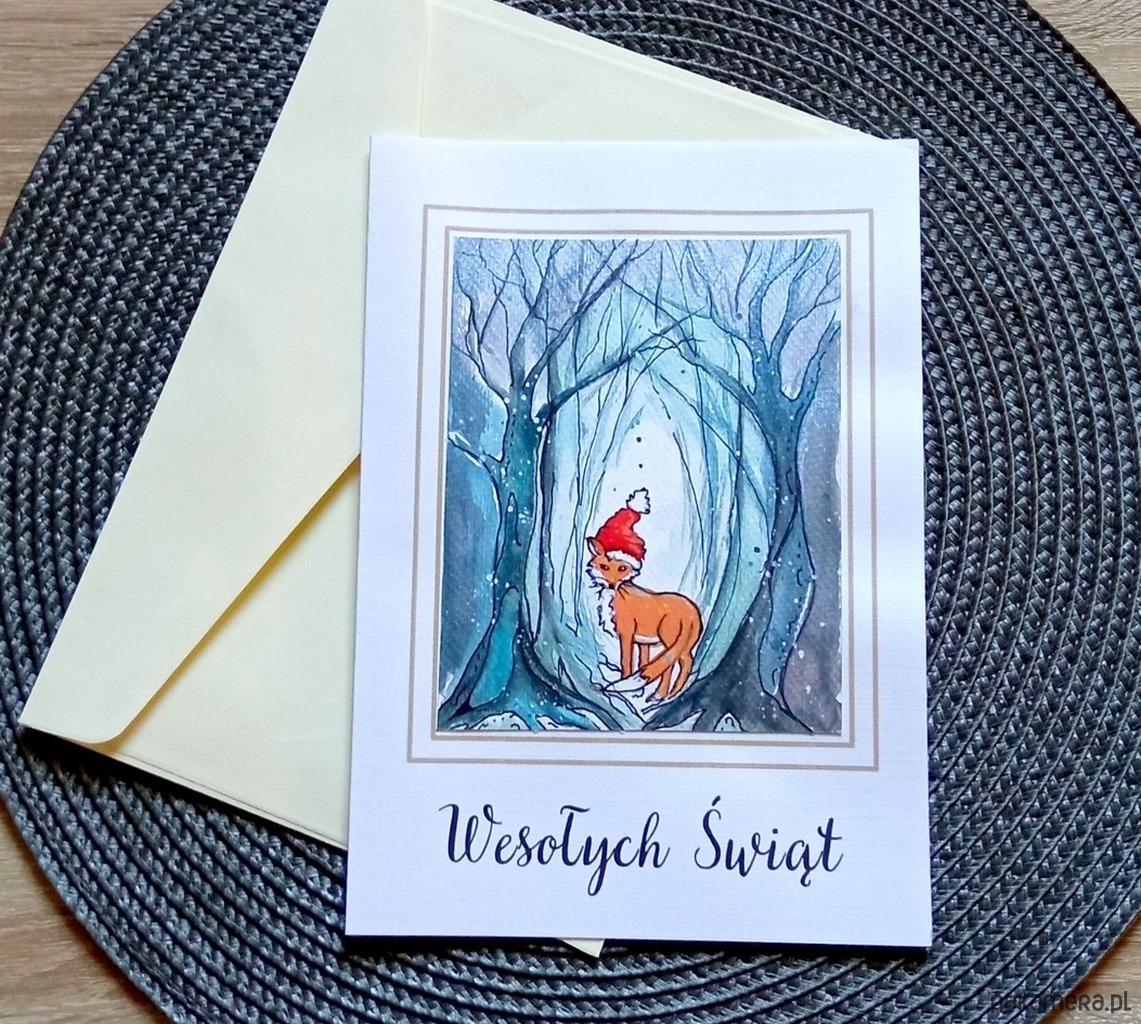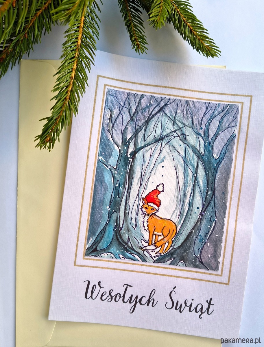 Kartka z ręcznie malowanym, niepowtarzalnym świątecznym obrazkiem.