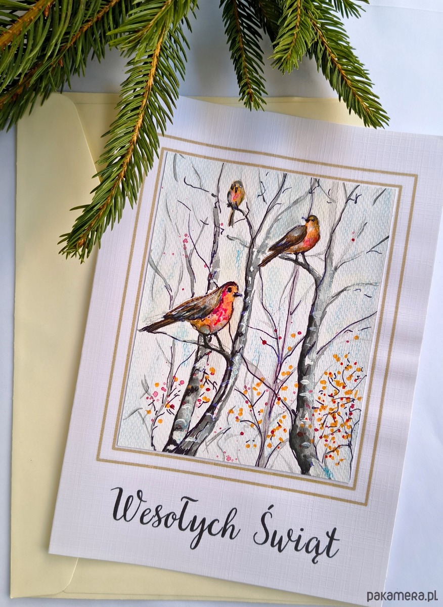 Kartka z ręcznie malowanym, niepowtarzalnym świątecznym obrazkiem.