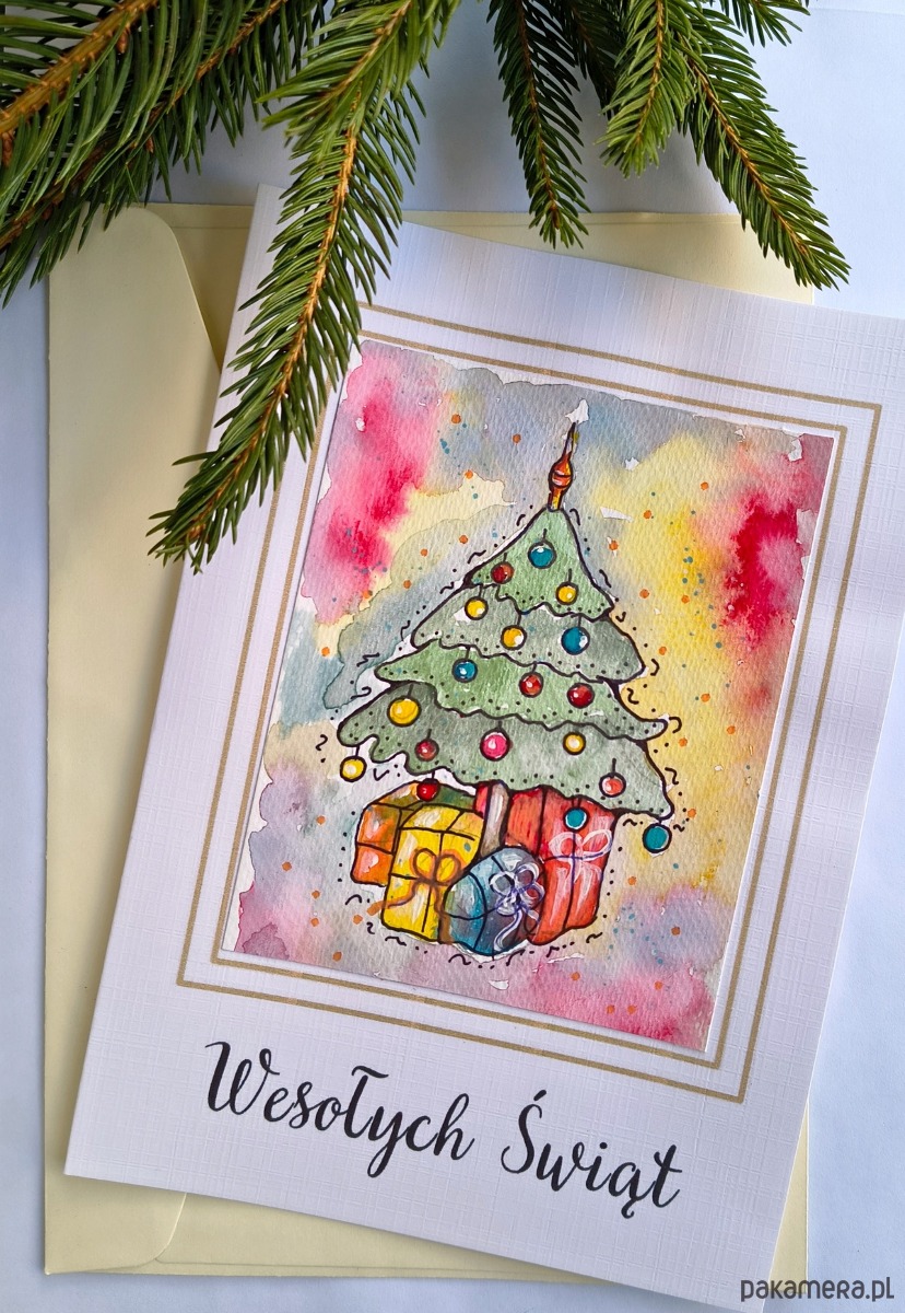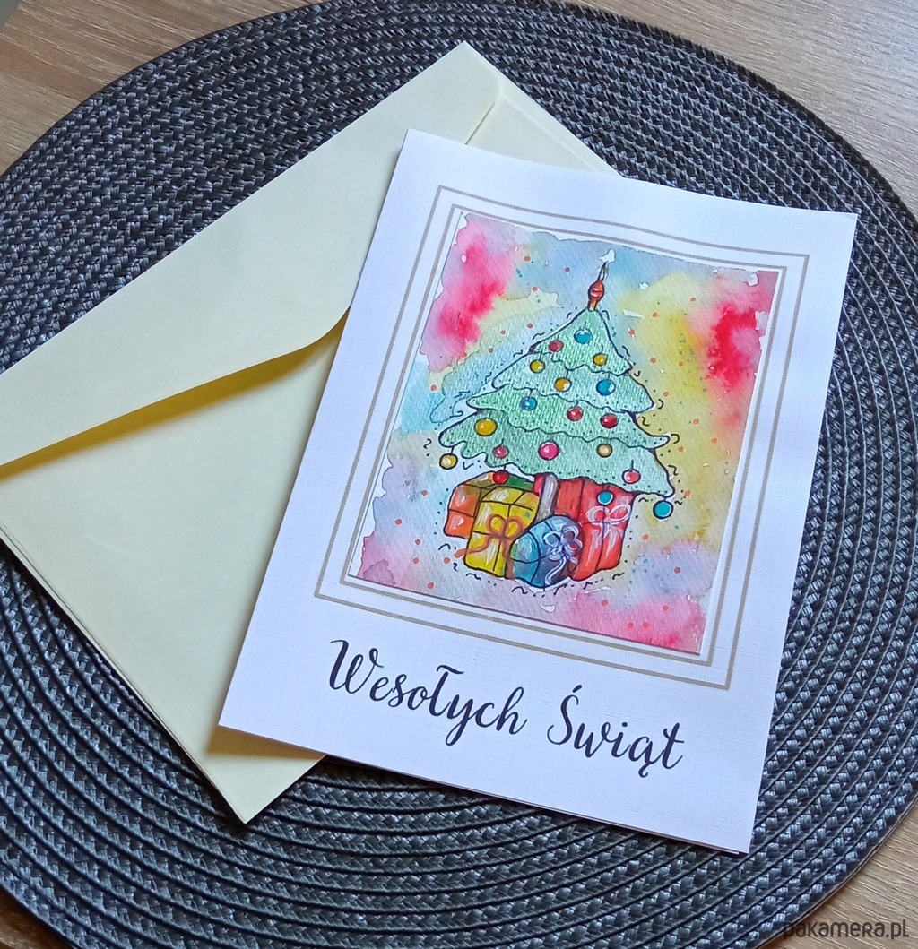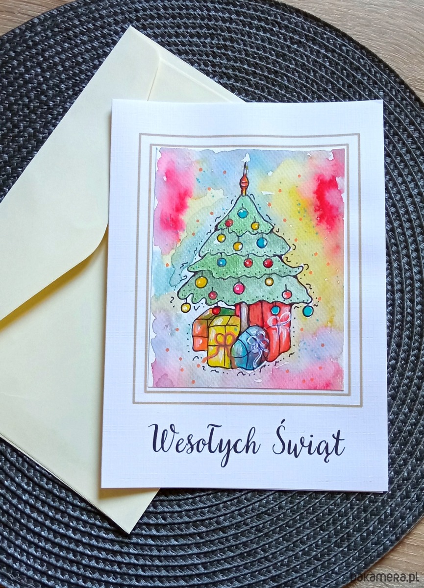 Kartka z ręcznie malowanym, niepowtarzalnym świątecznym obrazkiem.