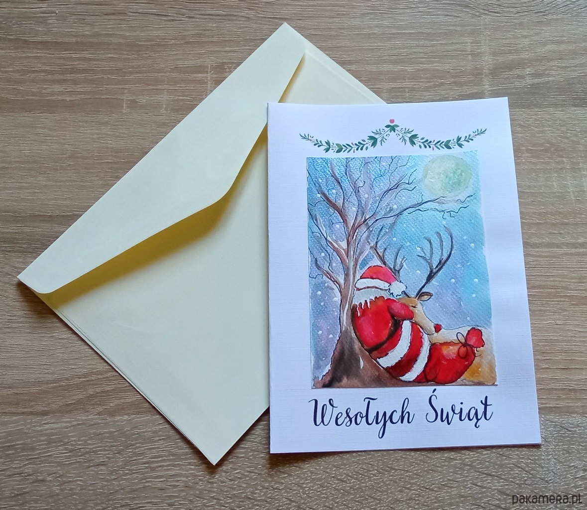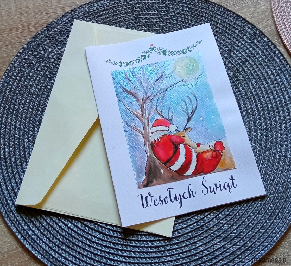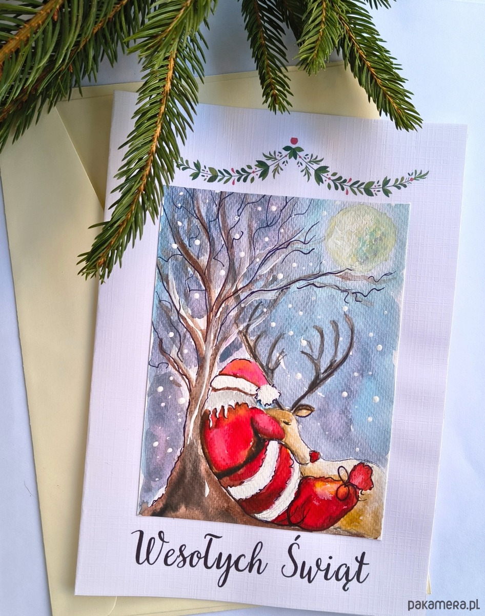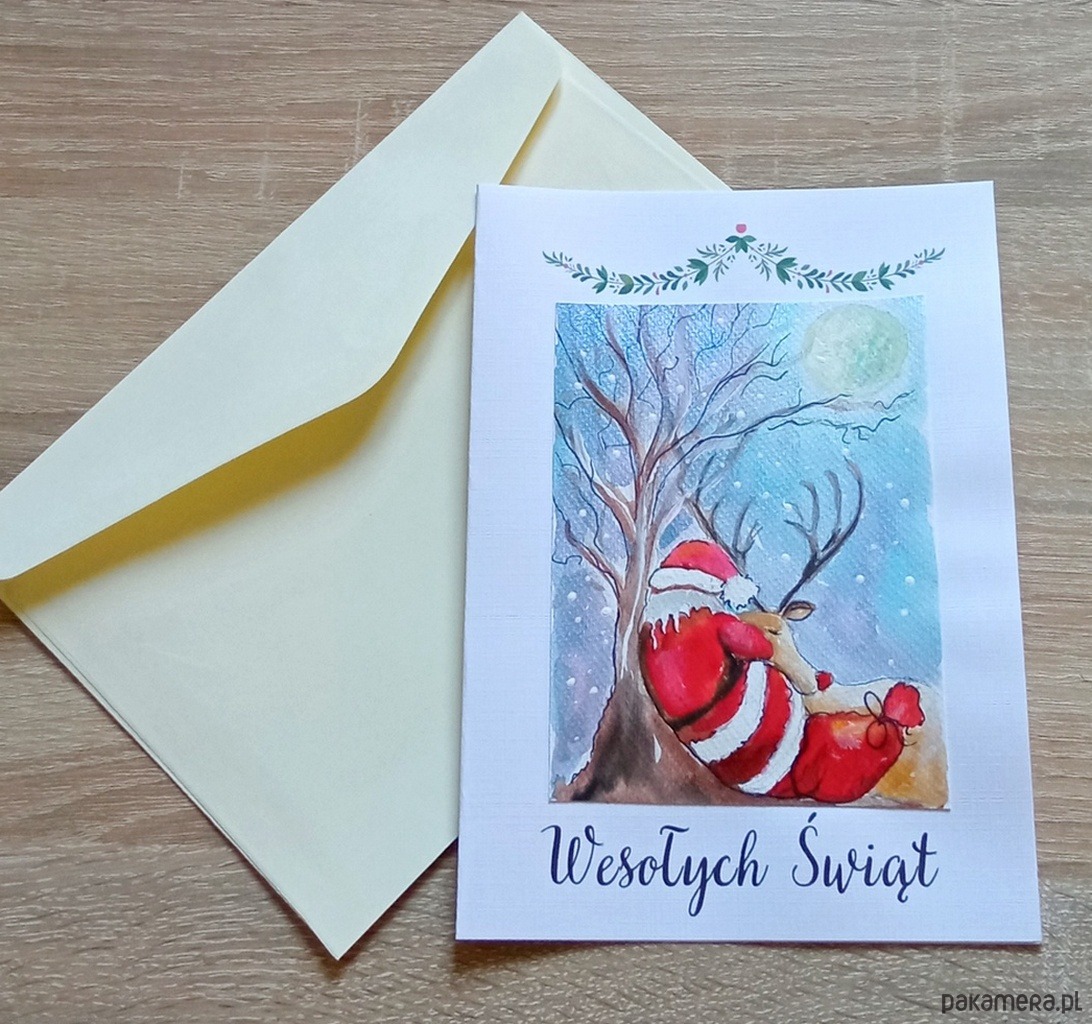 Kartka z ręcznie malowanym, niepowtarzalnym świątecznym obrazkiem.