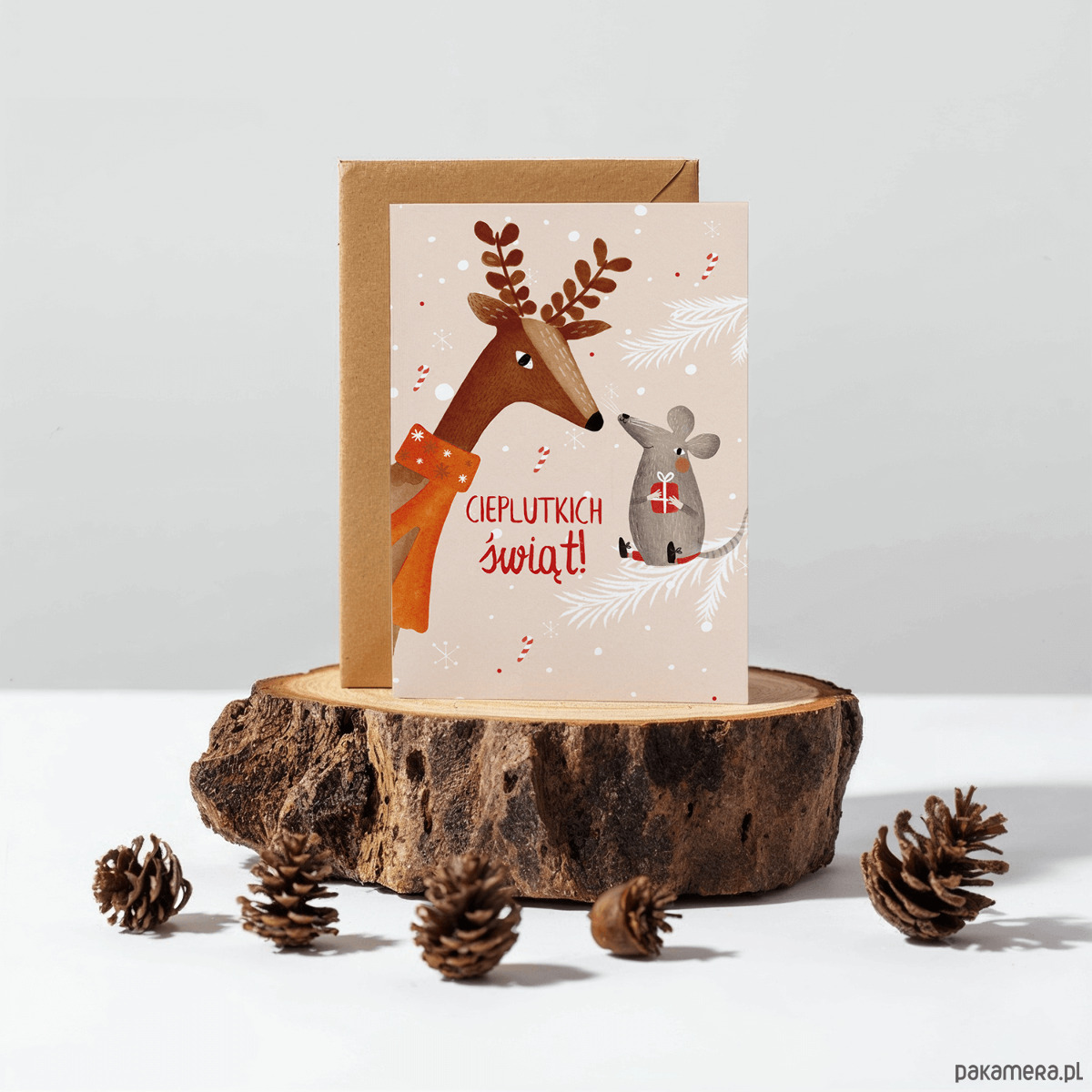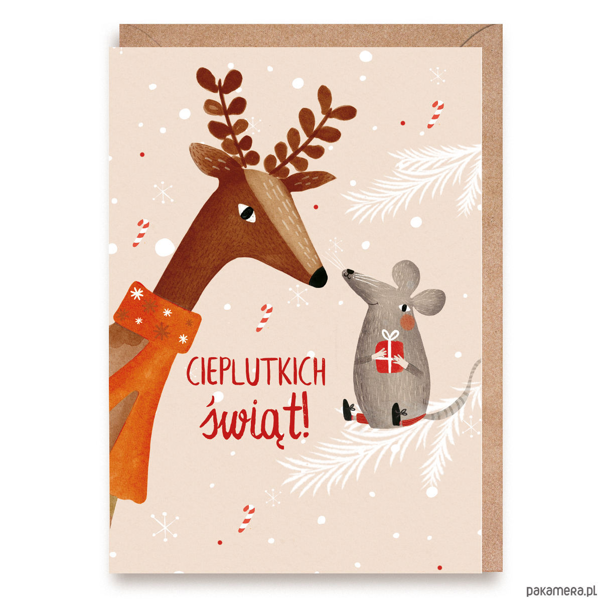 Kartka świąteczna Bożonarodzeniowa z reniferem "Cieplutkich Świąt"